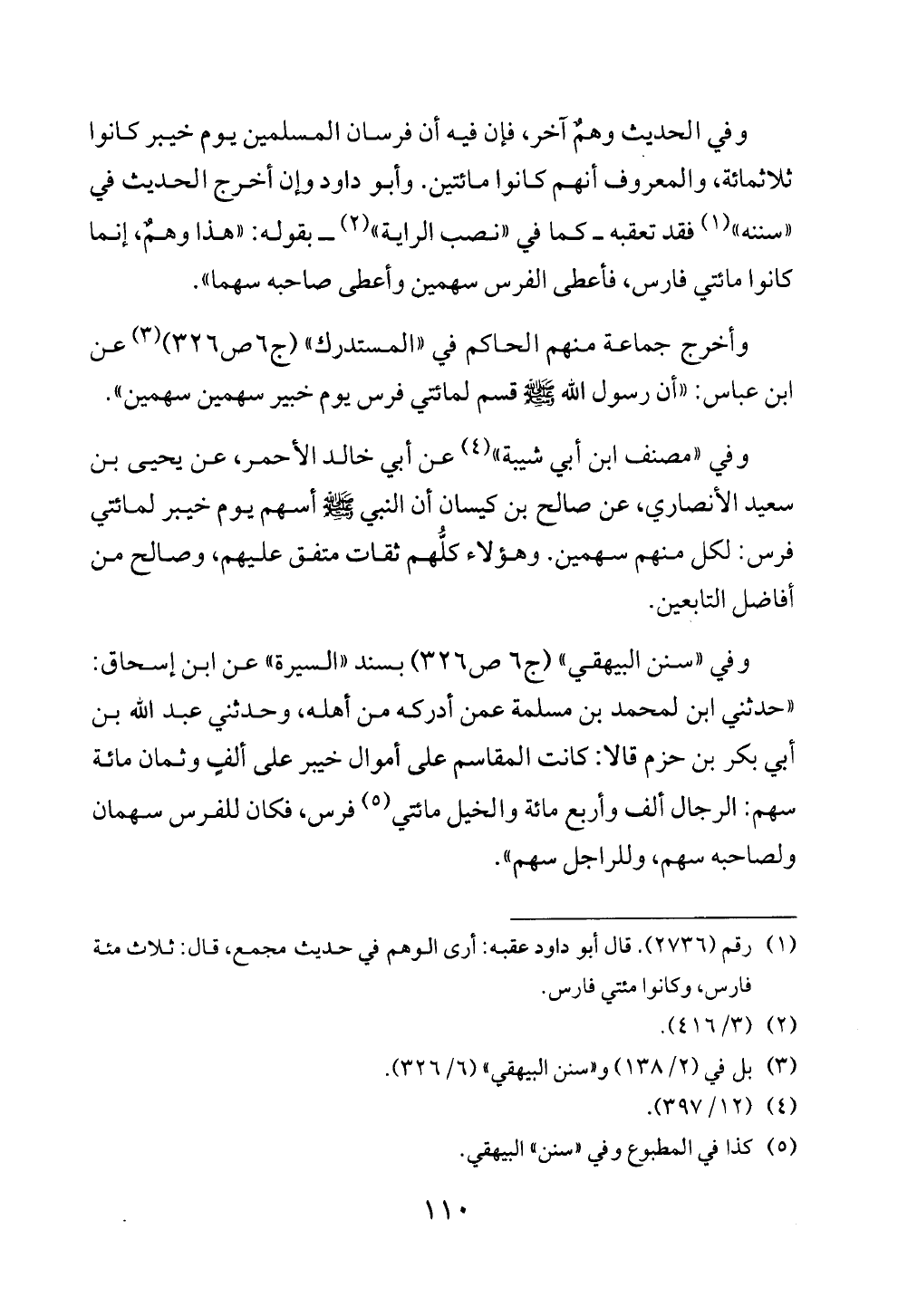 وأخرج جماعة منهم الحاكم في «المستدرك» (ج ٦ ص ٣٢٦) (¬٣) عن ابن عباس: «أن رسول الله - صلى الله عليه وسلم - قسم لمائتي فرس يوم خبير سهمين سهمين».