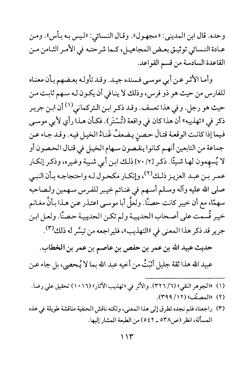 وأما الأثر عن أبي موسى فسنده جيد. وقد تأوله بعضهم بأن معناه للفارس من حيث هو ذو فرس، وذلك لا ينافي أن يكون له سهم ثابت من حيث هو رجل. وفي هذا تعسف. وقد ذكر ابن التركماني (¬١) أن ابن جرير ذكر في «تهذيبه» أن هذا كان في واقعة (تُسْتَر). فكأن هذا رأي لأبي موسى فيما إذا كانت الوقعة قتالَ حصنٍ يضعفُ غَناءُ الخيل فيه. وقد جاء عن جماعة من التابعين أنهم كانوا ينقصون سهام الخيل في قتال الحصون أو لا يُسهِمون لها شيئًا. ذكر [٢/ ٧٠] ذلك ابن أبي شيبة وغيره، وذكر إنكار عمر بن عبد العزيز ذلك (¬٢)، وإنكار مكحول له واحتجاجه بأن النبي صلى الله عليه وآله وسلم أسهم في غنائم خيبر للفرس سهمين ولصاحبه سهمًا، مع أن خيبر كانت حصنًا. ولعلَّ أبا موسى اعتذر عن هذا بأنَّ مغانم خيبر قُسمت على أصحاب الحديبية ولم تكن الحديبية حصنًا. ولعل ابن جرير قد ذكر هذا المعنى في «التهذيب»، فليراجعه من تيسَّر له ذلك (¬٣).
