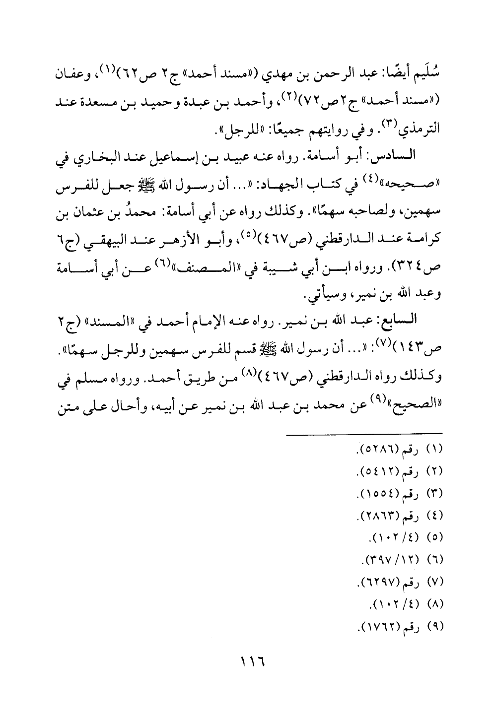 السابع: عبد الله بن نمير. رواه عنه الإمام أحمد في «المسند» (ج ٢ ص ١٤٣) (¬٧): « ... أن رسول الله - صلى الله عليه وسلم - قسم للفرس سهمين وللرجل سهمًا». وكذلك رواه الدارقطني (ص ٤٦٧) (¬٨) من طريق أحمد. ورواه مسلم في «الصحيح» (¬٩) عن محمد بن عبد الله بن نمير عن أبيه، وأحال على متن