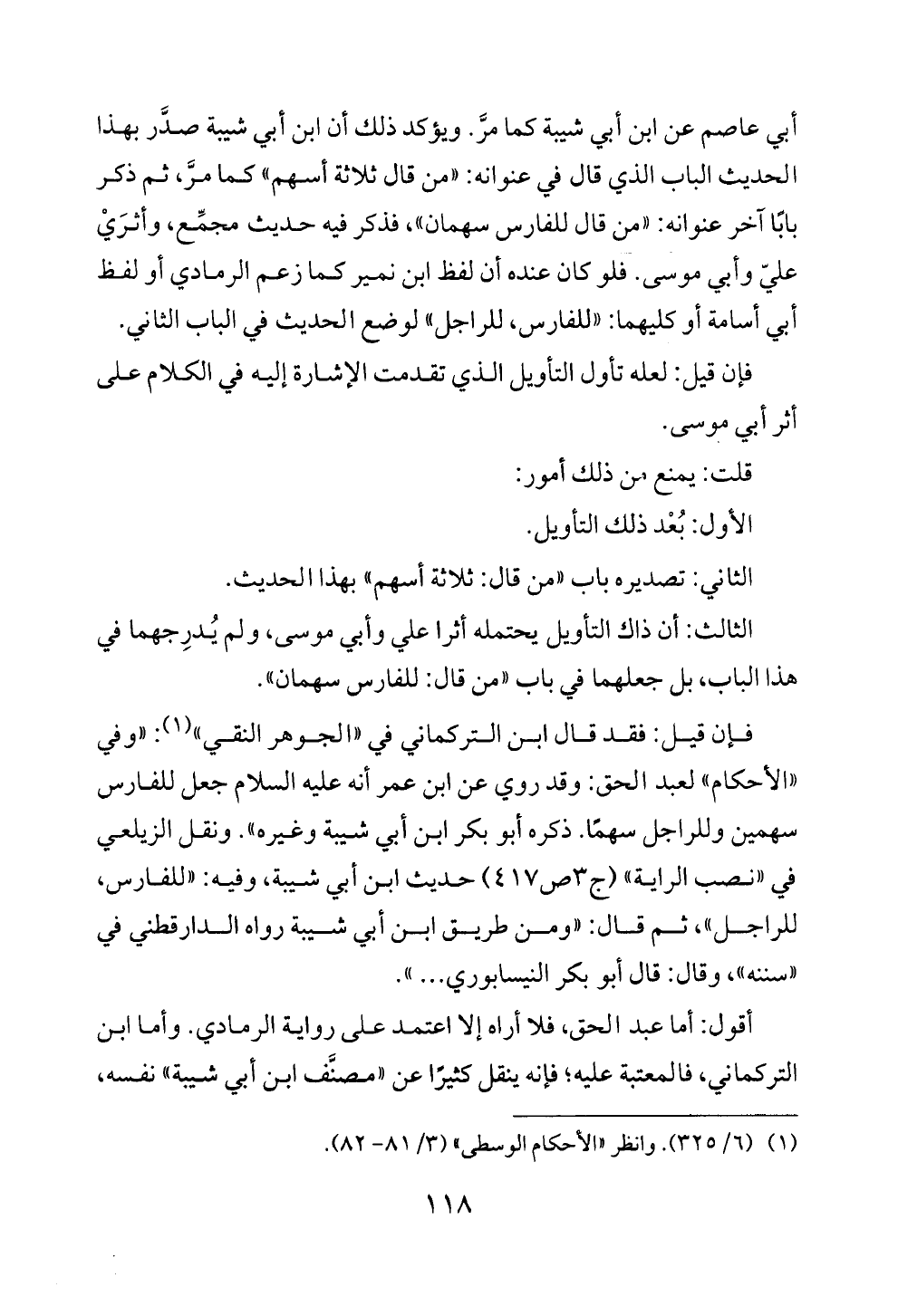 أبي عاصم عن ابن أبي شيبة كما مرَّ. ويؤكد ذلك أن ابن أبي شيبة صدَّر بهذا الحديث الباب الذي قال في عنوانه: «من قال ثلاثة أسهم» كما مرَّ, ثم ذكر بابًا آخر عنوانه: «من قال للفارس سهمان»، فذكر فيه حديث مجمِّع، وأثرَيْ عليّ وأبي موسى. فلو كان عنده أن لفظ ابن نمير كما زعم الرمادي أو لفظ أبي أسامة أو كليهما: «للفارس، للراجل» لوضع الحديث في الباب الثاني.