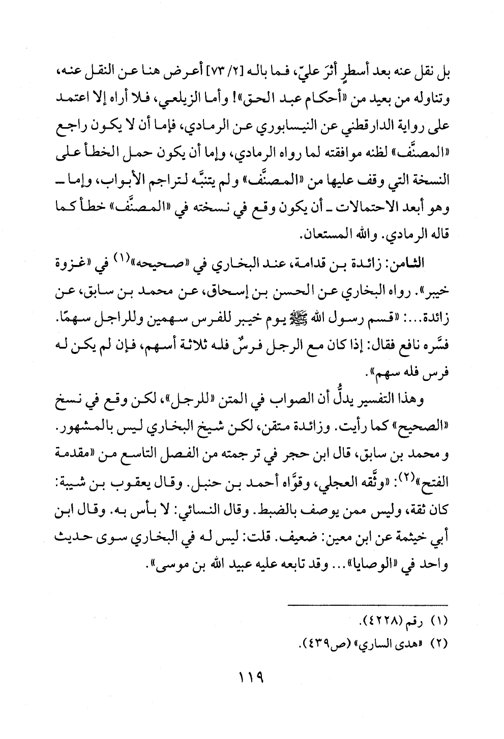 الثامن: زائدة بن قدامة، عند البخاري في «صحيحه» (¬١) في «غزوة خيبر». رواه البخاري عن الحسن بن إسحاق، عن محمد بن سابق، عن زائدة ... : «قسم رسول الله - صلى الله عليه وسلم - يوم خيبر للفرس سهمين وللراجل سهمًا. فسَّره نافع فقال: إذا كان مع الرجل فرسٌ فله ثلاثة أسهم، فإن لم يكن له فرس فله سهم».