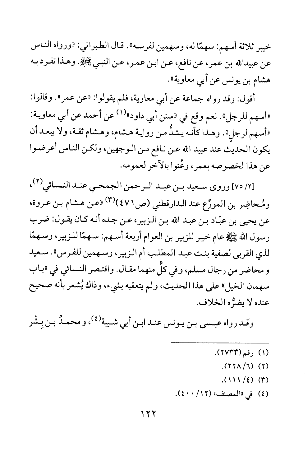 خيبر ثلاثة أسهم: سهمًا له، وسهمين لفرسه». قال الطبراني: «ورواه الناس عن عبيدالله بن عمر، عن نافع، عن ابن عمر، عن النبي - صلى الله عليه وسلم - . وهذا تفرد به هشام بن يونس عن أبي معاوية».
