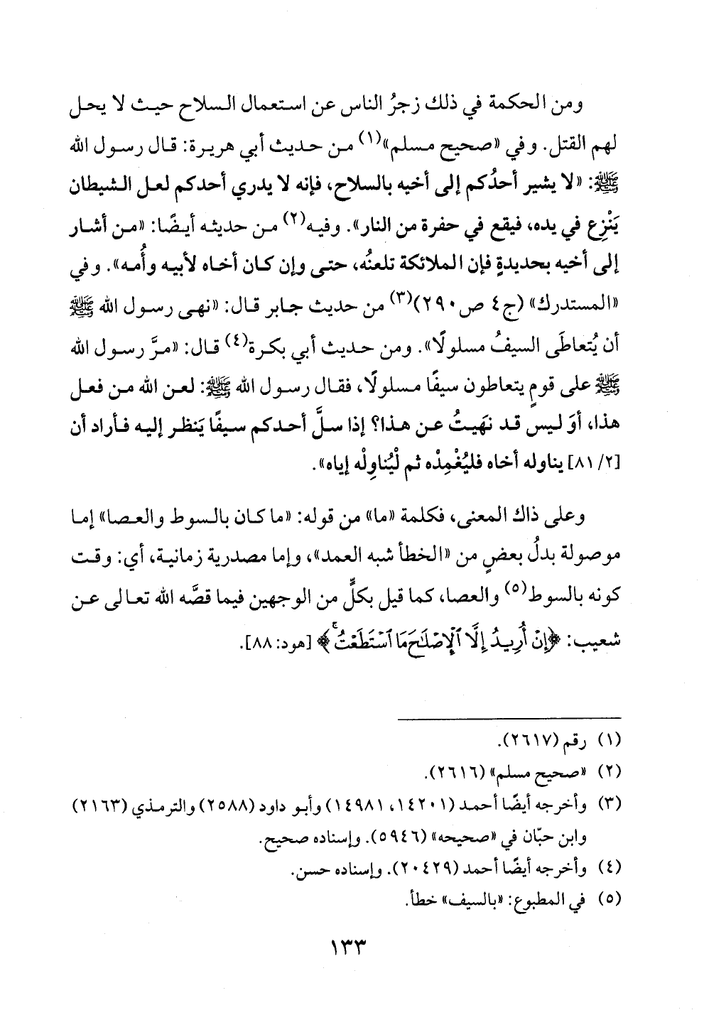 ومن الحكمة في ذلك زجرُ الناس عن استعمال السلاح حيث لا يحل لهم القتل. وفي «صحيح مسلم» (¬١) من حديث أبي هريرة: قال رسول الله - صلى الله عليه وسلم - : «لا يشير أحدُكم إلى أخيه بالسلاح، فإنه لا يدري أحدكم لعل الشيطان يَنْزِع في يده، فيقع في حفرة من النار». وفيه (¬٢) من حديثه أيضًا: «من أشار إلى أخيه بحديدةٍ فإن الملائكة تلعنُه، حتى وإن كان أخاه لأبيه وأُمه». وفي «المستدرك» (ج ٤ ص ٢٩٠) (¬٣) من حديث جابر قال: «نهى رسول الله - صلى الله عليه وسلم - أن يُتعاطَى السيفُ مسلولًا». ومن حديث أبي بكرة (¬٤) قال: «مرَّ رسول الله - صلى الله عليه وسلم - على قومٍ يتعاطون سيفًا مسلولًا، فقال رسول الله - صلى الله عليه وسلم - : لعن الله من فعل هذا، أوَ ليس قد نَهيتُ عن هذا؟ إذا سلَّ أحدكم سيفًا يَنظر إليه فأراد أن [٢/ ٨١] يناوله أخاه فليُغْمِدْه ثم لْيُناوِلْه إياه».