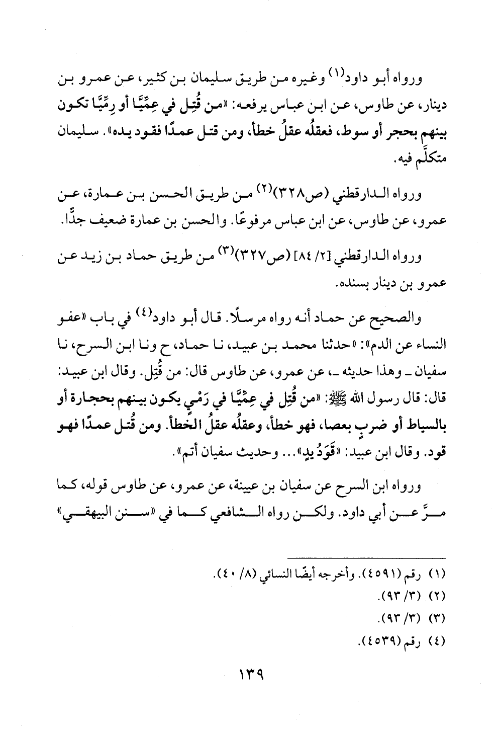 والصحيح عن حماد أنه رواه مرسلًا. قال أبو داود (¬٤) في باب «عفو النساء عن الدم»: «حدثنا محمد بن عبيد، نا حماد، ح ونا ابن السرح، نا سفيان ــ وهذا حديثه ــ، عن عمرو، عن طاوس قال: من قُتِل. وقال ابن عبيد: قال: قال رسول الله - صلى الله عليه وسلم - : «من قُتِل في عِمِّيَّا في رَمْيٍ يكون بينهم بحجارة أو بالسياط أو ضربٍ بعصا، فهو خطأ، وعقلُه عقلُ الخطأ. ومن قُتل عمدًا فهو قود. وقال ابن عبيد: «قَوَدُ يدٍ» ... وحديث سفيان أتم».