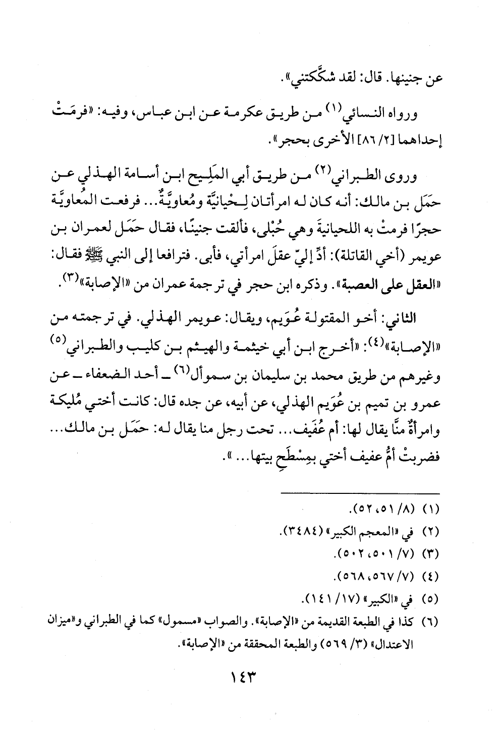 الثاني: أخو المقتولة عُوَيم، ويقال: عويمر الهذلي. في ترجمته من «الإصابة» (¬٤): «أخرج ابن أبي خيثمة والهيثم بن كليب والطبراني (¬٥) وغيرهم من طريق محمد بن سليمان بن سموأل (¬٦) ــ أحد الضعفاء ــ عن عمرو بن تميم بن عُوَيم الهذلي، عن أبيه، عن جده قال: كانت أختي مُليكة وامرأةٌ منَّا يقال لها: أم عُفَيف ... تحت رجل منا يقال له: حَمَل بن مالك ... فضربتْ أمُّ عفيف أختي بمِسْطَحِ بيتها ... ».
