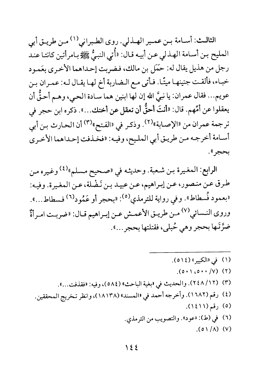 الثالث: أسامة بن عمير الهذلي. روى الطبراني (¬١) من طريق أبي المليح بن أسامة الهذلي عن أبيه قال: «أُتِي النبيُّ - صلى الله عليه وسلم - بامرأتين كانتا عند رجل من هذيل يقال له: حَمَل بن مالك، فضربت إحداهما الأخرى بعَمود خباء، فألقت جنينها ميتًا. فأتى مع الضاربة أخ لها يقال له: عمران بن عويم ... فقال عمران: يا نبيَّ الله إن لها ابنين هما سادة الحي، وهم أحقُّ أن يعقلوا عن أمِّهم. قال: «أنتَ أحقُّ أن تعقل عن أختك ... ». ذكره ابن حجر في ترجمة عمران من «الإصابة» (¬٢). وذكر في «الفتح» (¬٣) أن الحارث بن أبي أسامة أخرجه من طريق أبي المليح، وفيه: «فخذفت إحداهما الأخرى بحجر».