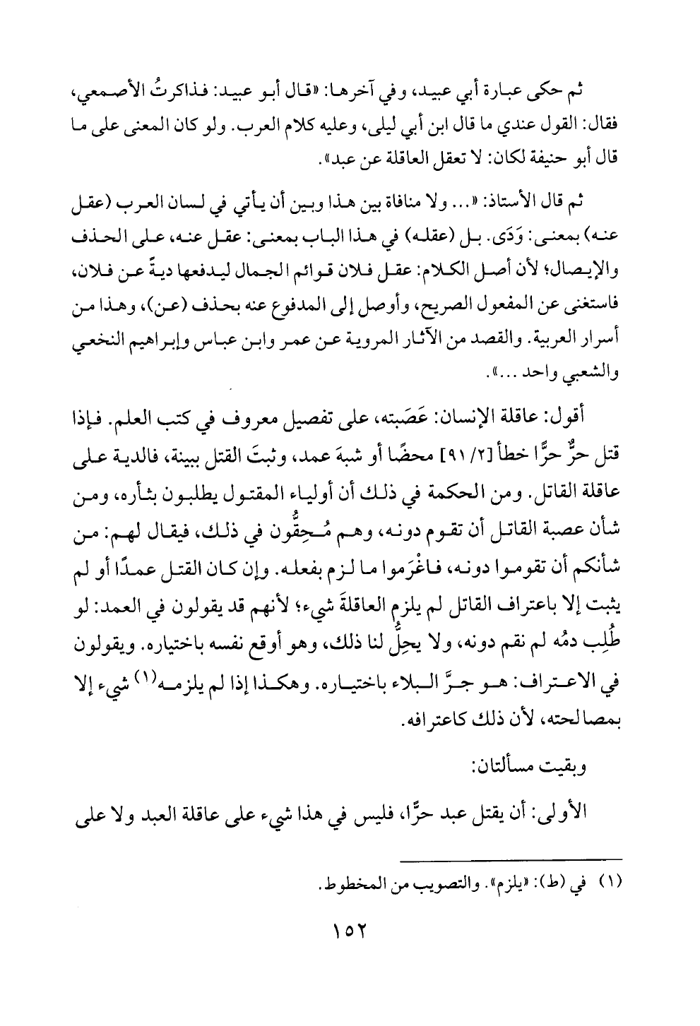 ثم حكى عبارة أبي عبيد، وفي آخرها: «قال أبو عبيد: فذاكرتُ الأصمعي، فقال: القول عندي ما قال ابن أبي ليلى، وعليه كلام العرب. ولو كان المعنى على ما قال أبو حنيفة لكان: لا تعقل العاقلة عن عبد».