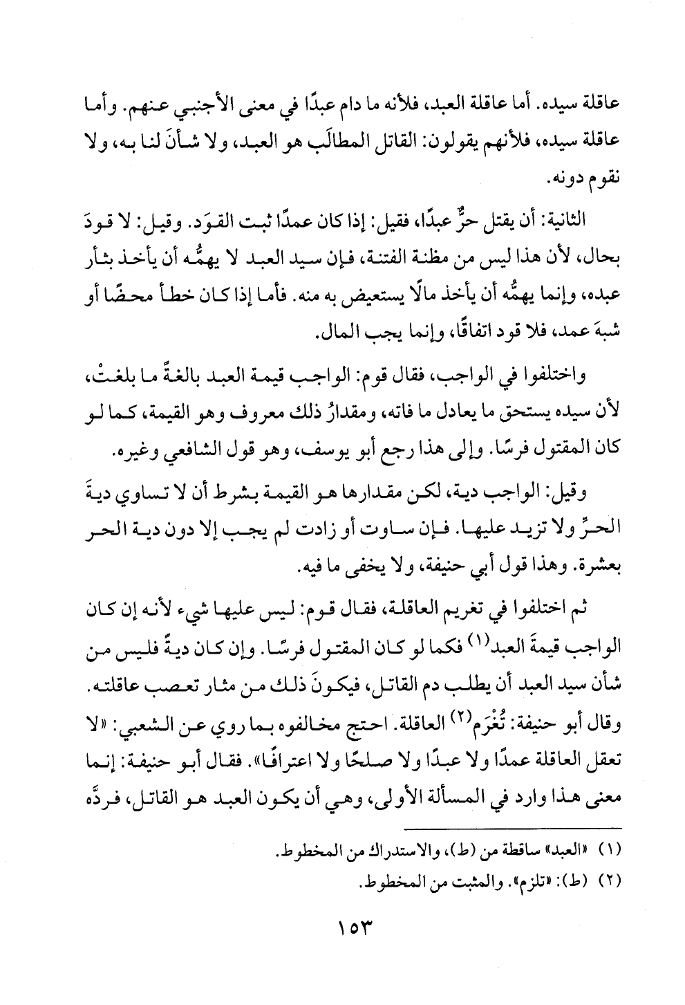 الثانية: أن يقتل حرٌّ عبدًا، فقيل: إذا كان عمدًا ثبت القوَد. وقيل: لا قودَ بحال، لأن هذا ليس من مظنة الفتنة، فإن سيد العبد لا يهمُّه أن يأخذ بثأر عبده، وإنما يهمُّه أن يأخذ مالًا يستعيض به منه. فأما إذا كان خطأ محضًا أو شبهَ عمد، فلا قود اتفاقًا، وإنما يجب المال.