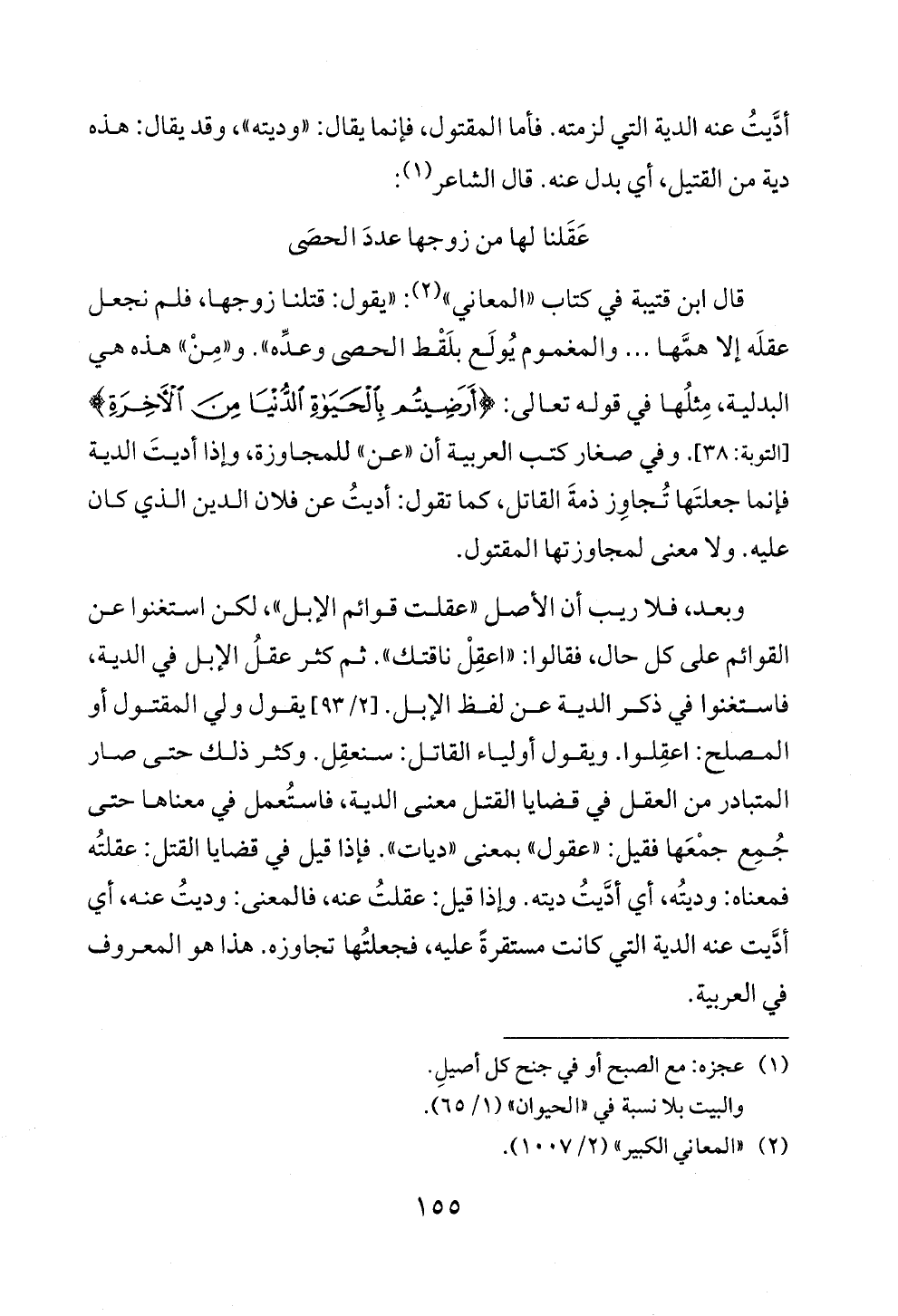 وبعد، فلا ريب أن الأصل «عقلت قوائم الإبل»، لكن استغنوا عن القوائم على كل حال، فقالوا: «اعقِلْ ناقتك». ثم كثر عقلُ الإبل في الدية، فاستغنوا في ذكر الدية عن لفظ الإبل. [٢/ ٩٣] يقول ولي المقتول أو المصلح: اعقِلوا. ويقول أولياء القاتل: سنعقِل. وكثر ذلك حتى صار المتبادر من العقل في قضايا القتل معنى الدية، فاستُعمل في معناها حتى جُمِع جمْعَها فقيل: «عقول» بمعنى «ديات». فإذا قيل في قضايا القتل: عقلتُه فمعناه: وديتُه، أي أدَّيتُ ديته. وإذا قيل: عقلتُ عنه، فالمعنى: وديتُ عنه، أي أدَّيت عنه الدية التي كانت مستقرةً عليه، فجعلتُها تجاوزه. هذا هو المعروف في العربية.