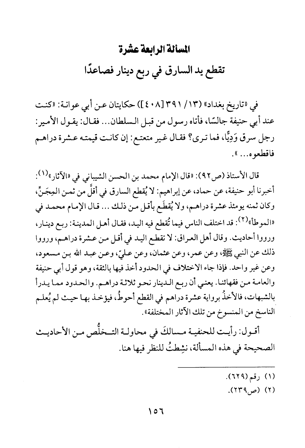 قال الأستاذ (ص ٩٢): «قال الإمام محمد بن الحسن الشيباني في «الآثار» (¬١): أخبرنا أبو حنيفة، عن حماد، عن إبراهيم: لا يُقطع السارق في أقلَّ من ثمن المِجَنِّ، وكان ثمنه يومئذ عشرة دراهم، ولا يُقطَع بأقل من ذلك ... قال الإمام محمد في «الموطأ» (¬٢): قد اختلف الناس فيما تُقطع فيه اليد، فقال أهل المدينة: ربع دينار، ورووا أحاديث. وقال أهل العراق: لا تقطع اليد في أقل من عشرة دراهم، ورووا ذلك عن النبي - صلى الله عليه وسلم -، وعن عمر، وعن عثمان، وعن عليّ، وعن عبد الله بن مسعود، وعن غير واحد. فإذا جاء الاختلاف في الحدود أخذ فيها بالثقة، وهو قول أبي حنيفة والعامة من فقهائنا. يعني أن ربع الدينار نحو ثلاثة دراهم. والحدود مما يدرأ بالشبهات، فالأخذُ برواية عشرة دراهم في القطع أحوطُ، فيؤخذ بها حيث لم يُعلم الناسخ من المنسوخ من تلك الآثار المختلفة».