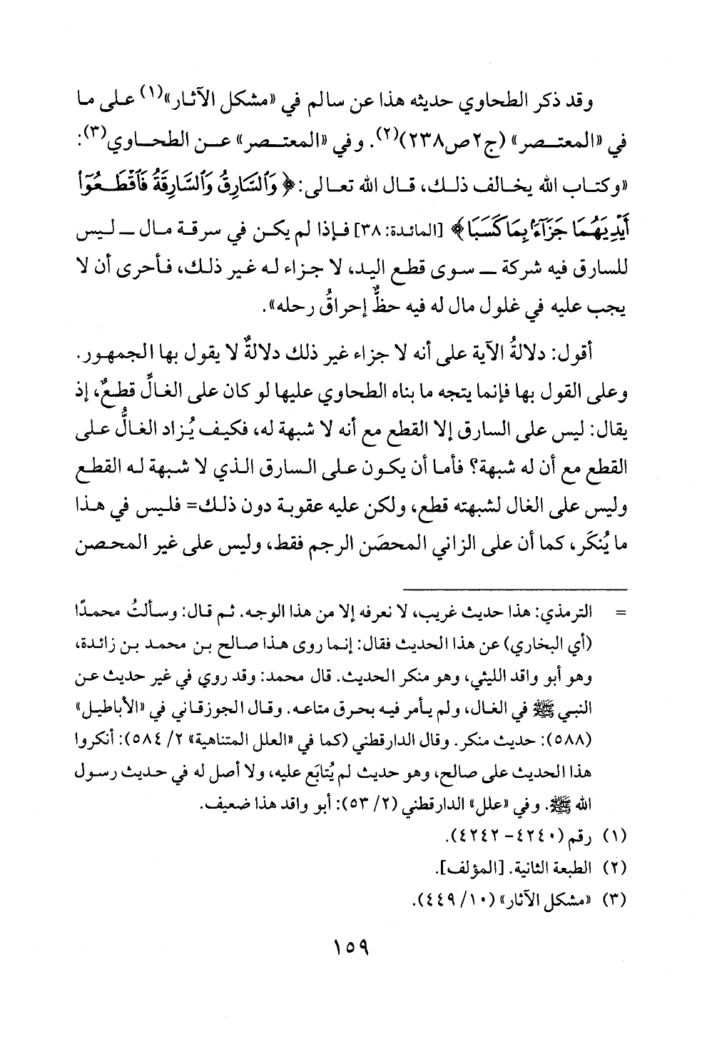وقد ذكر الطحاوي حديثه هذا عن سالم في «مشكل الآثار» (¬١) على ما في «المعتصر» (ج ٢ ص ٢٣٨) (¬٢). وفي «المعتصر» عن الطحاوي (¬٣): «وكتاب الله يخالف ذلك، قال الله تعالى: {وَالسَّارِقُ وَالسَّارِقَةُ فَاقْطَعُوا أَيْدِيَهُمَا جَزَاءً بِمَا كَسَبَا} [المائدة: ٣٨] فإذا لم يكن في سرقة مال ــ ليس للسارق فيه شركة ــ سوى قطع اليد، لا جزاء له غير ذلك، فأحرى أن لا يجب عليه في غلول مال له فيه حظٌّ إحراقُ رحله».