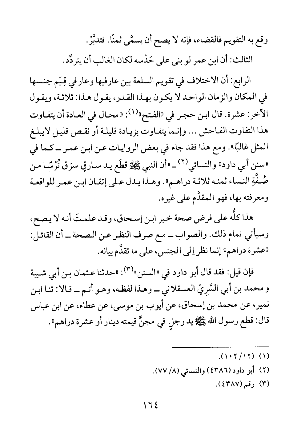 الرابع: أن الاختلاف في تقويم السلعة بين عارفيها وعارفي قِيَم جنسها في المكان والزمان الواحد لا يكون بهذا القدر، يقول هذا: ثلاثة، ويقول الآخر: عشرة. قال ابن حجر في «الفتح» (¬١): «محال في العادة أن يتفاوت هذا التفاوت الفاحش ... وإنما يتفاوت بزيادة قليلة أو نقص قليل لايبلغ المثل غالبًا». ومع هذا فقد جاء في بعض الروايات عن ابن عمر ــ كما في «سنن أبي داود» والنسائي (¬٢) ــ «أن النبي - صلى الله عليه وسلم - قطَع يد سارقٍ سرَق تُرْسًا من صُفَّةِ النساء ثمنه ثلاثة دراهم». وهذا يدل على إتقان ابن عمر للواقعة ومعرفته بها، فهو المقدَّم على غيره.