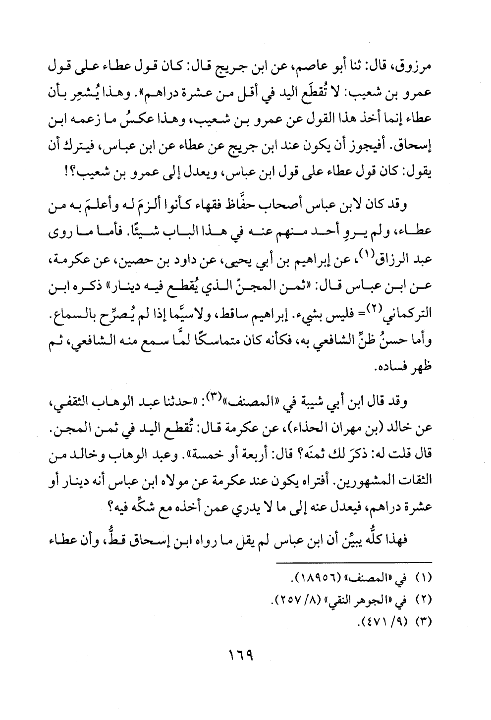 مرزوق، قال: ثنا أبو عاصم، عن ابن جريج قال: كان قول عطاء على قول عمرو بن شعيب: لا تُقطَع اليد في أقل من عشرة دراهم». وهذا يُشعِر بأن عطاء إنما أخذ هذا القول عن عمرو بن شعيب، وهذا عكسُ ما زعمه ابن إسحاق. أفيجوز أن يكون عند ابن جريج عن عطاء عن ابن عباس، فيترك أن يقول: كان قول عطاء على قول ابن عباس، ويعدل إلى عمرو بن شعيب؟ !