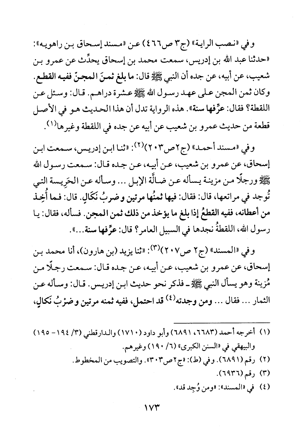 وفي «نصب الراية» (ج ٣ ص ٤٦٦) عن «مسند إسحاق بن راهويه»: «حدثنا عبد الله بن إدريس، سمعت محمد بن إسحاق يحدِّث عن عمرو بن شعيب، عن أبيه، عن جده أن النبي - صلى الله عليه وسلم - قال: ما بلغ ثمنَ المجنّ ففيه القطع. وكان ثمن المجن على عهد رسول الله - صلى الله عليه وسلم - عشرة دراهم. قال: وسئل عن اللقطة؟ فقال: عرِّفها سنة». هذه الرواية تدل أن هذا الحديث هو في الأصل قطعة من حديث عمرو بن شعيب عن أبيه عن جده في اللقطة وغيرها (¬١).