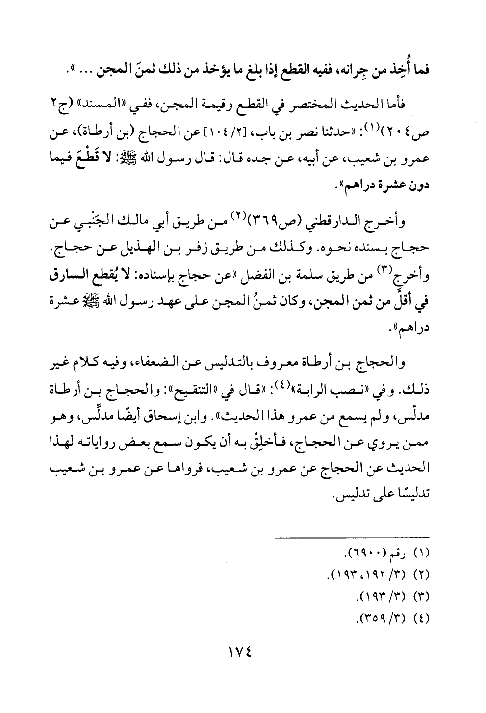 وأخرج الدارقطني (ص ٣٦٩) (¬٢) من طريق أبي مالك الجَنْبي عن حجاج بسنده نحوه. وكذلك من طريق زفر بن الهذيل عن حجاج. وأخرج (¬٣) من طريق سلمة بن الفضل «عن حجاج بإسناده: لا يُقطع السارق في أقلَّ من ثمن المجن، وكان ثمنُ المجن على عهد رسول الله - صلى الله عليه وسلم - عشرة دراهم».