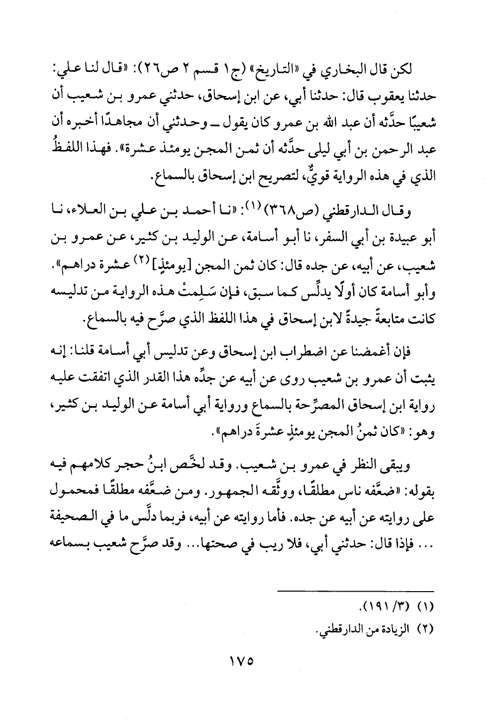 لكن قال البخاري في «التاريخ» (ج ١ قسم ٢ ص ٢٦): «قال لنا علي: حدثنا يعقوب قال: حدثنا أبي، عن ابن إسحاق، حدثني عمرو بن شعيب أن شعيبًا حدَّثه أن عبد الله بن عمرو كان يقول ــ وحدثني أن مجاهدًا أخبره أن عبد الرحمن بن أبي ليلى حدَّثه أن ثمن المجن يومئذ عشرة». فهذا اللفظُ الذي في هذه الرواية قويٌّ، لتصريح ابن إسحاق بالسماع.