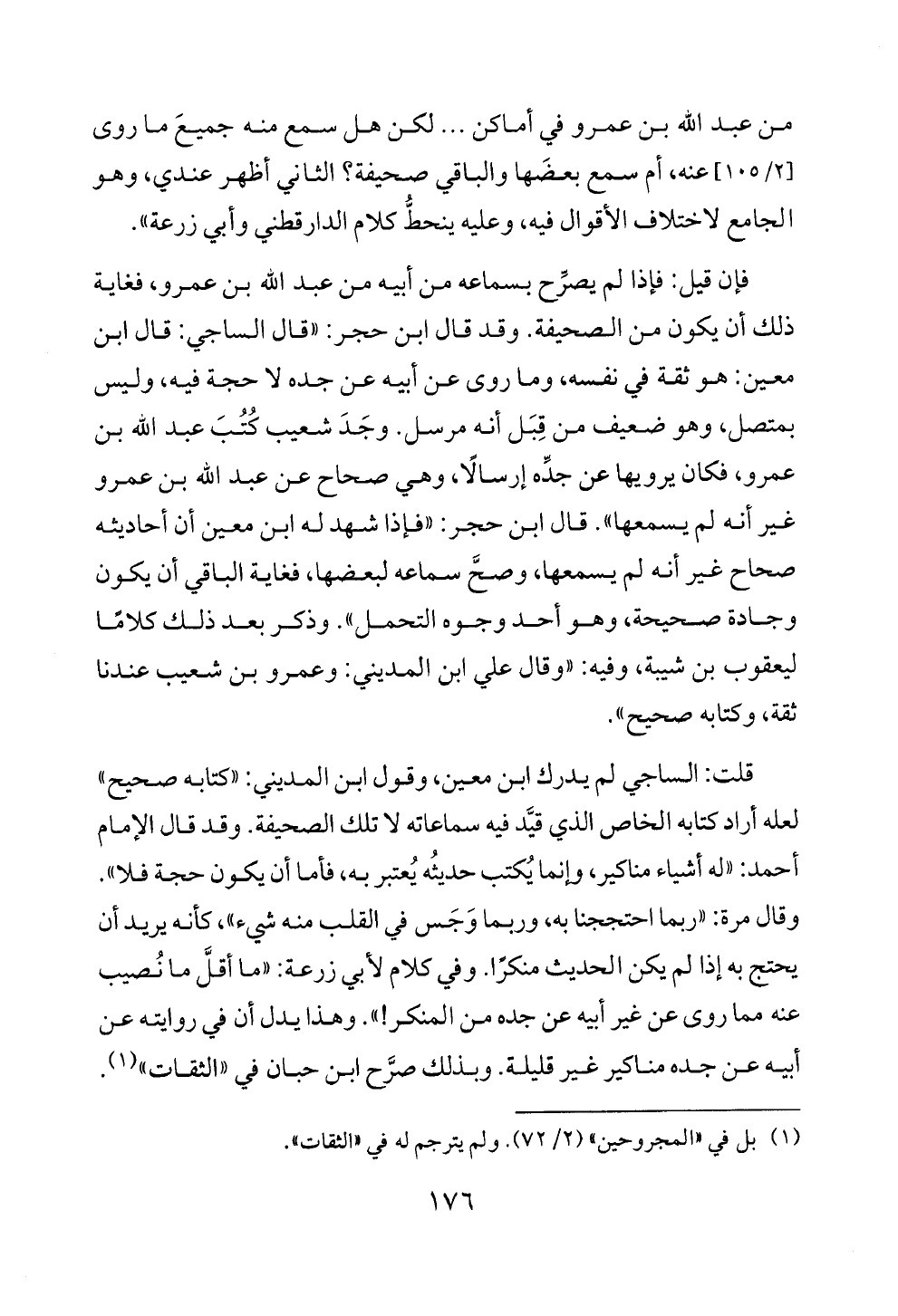 قلت: الساجي لم يدرك ابن معين، وقول ابن المديني: «كتابه صحيح» لعله أراد كتابه الخاص الذي قيَّد فيه سماعاته لا تلك الصحيفة. وقد قال الإمام أحمد: «له أشياء مناكير، وإنما يُكتب حديثُه يُعتبر به، فأما أن يكون حجة فلا». وقال مرة: «ربما احتججنا به، وربما وَجَس في القلب منه شيء»، كأنه يريد أن يحتج به إذا لم يكن الحديث منكرًا. وفي كلام لأبي زرعة: «ما أقلَّ ما نُصيب عنه مما روى عن غير أبيه عن جده من المنكر! ». وهذا يدل أن في روايته عن أبيه عن جده مناكير غير قليلة. وبذلك صرَّح ابن حبان في «الثقات» (¬١).
