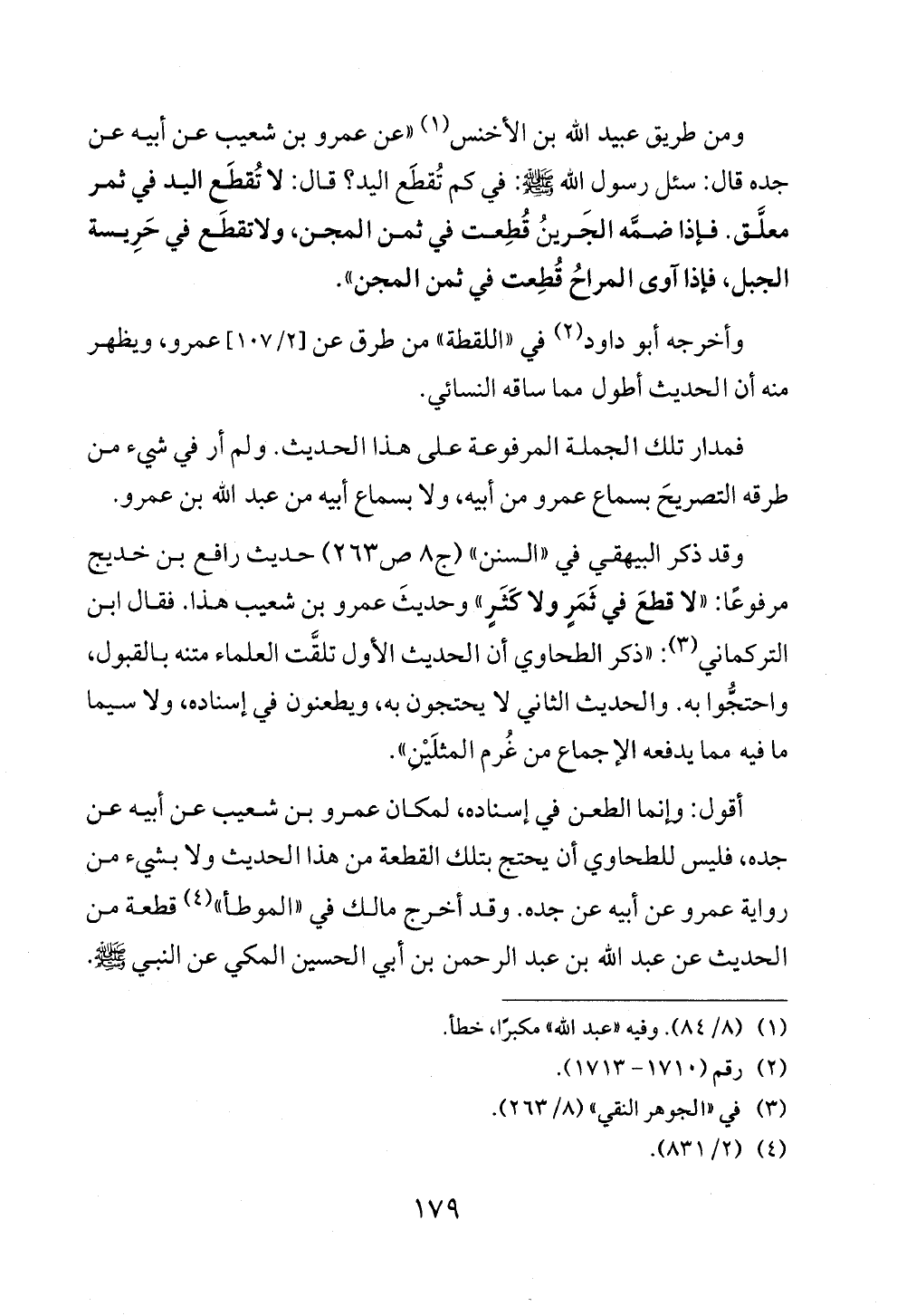 أقول: وإنما الطعن في إسناده، لمكان عمرو بن شعيب عن أبيه عن جده، فليس للطحاوي أن يحتج بتلك القطعة من هذا الحديث ولا بشيء من رواية عمرو عن أبيه عن جده. وقد أخرج مالك في «الموطأ» (¬٤) قطعة من الحديث عن عبد الله بن عبد الرحمن بن أبي الحسين المكي عن النبي - صلى الله عليه وسلم - .