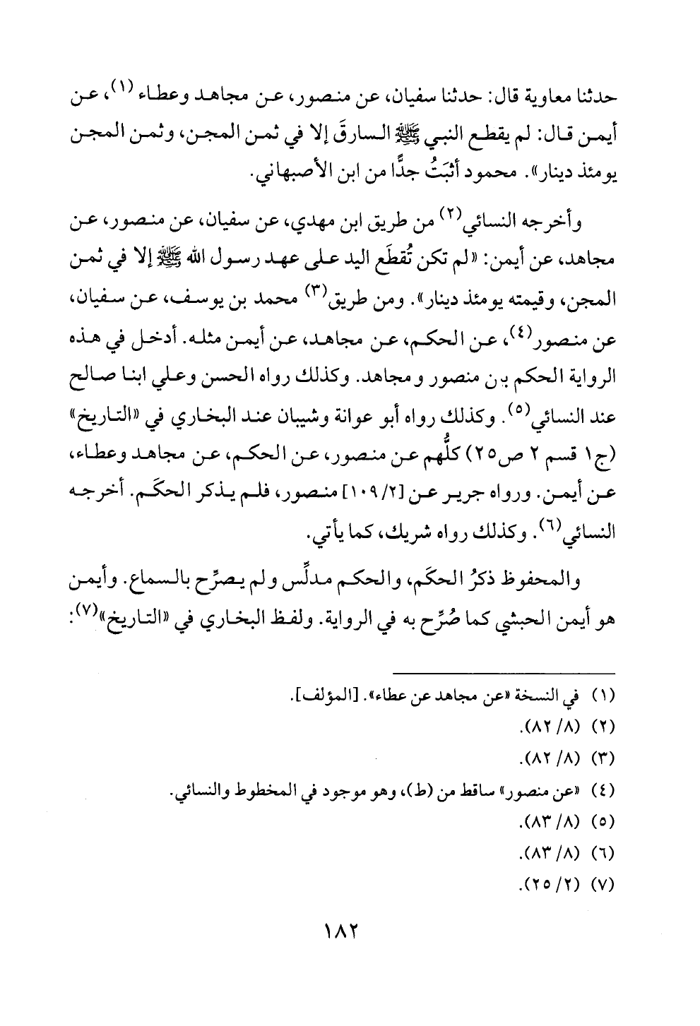 وأخرجه النسائي (¬٢) من طريق ابن مهدي، عن سفيان، عن منصور، عن مجاهد، عن أيمن: «لم تكن تُقطَع اليد على عهد رسول الله - صلى الله عليه وسلم - إلا في ثمن المجن، وقيمته يومئذ دينار». ومن طريق (¬٣) محمد بن يوسف، عن سفيان، عن منصور (¬٤)، عن الحكم، عن مجاهد، عن أيمن مثله. أدخل في هذه الرواية الحكم بين منصور ومجاهد. وكذلك رواه الحسن وعلي ابنا صالح عند النسائي (¬٥). وكذلك رواه أبو عوانة وشيبان عند البخاري في «التاريخ» (ج ١ قسم ٢ ص ٢٥) كلُّهم عن منصور، عن الحكم، عن مجاهد وعطاء، عن أيمن. ورواه جرير عن [٢/ ١٠٩] منصور، فلم يذكر الحكَم. أخرجه النسائي (¬٦). وكذلك رواه شريك، كما يأتي.