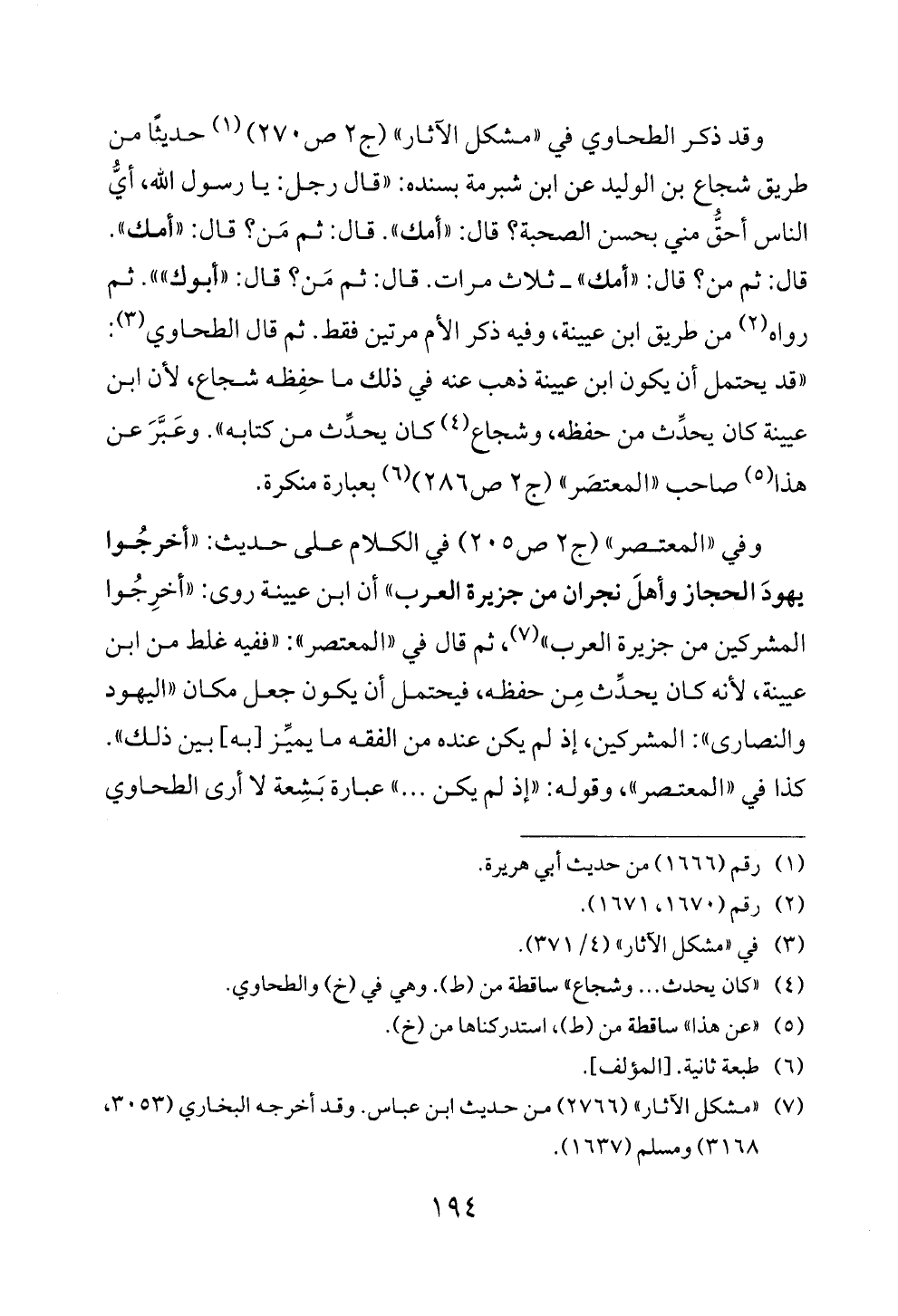 وقد ذكر الطحاوي في «مشكل الآثار» (ج ٢ ص ٢٧٠) (¬١) حديثًا من طريق شجاع بن الوليد عن ابن شبرمة بسنده: «قال رجل: يا رسول الله، أيُّ الناس أحقُّ مني بحسن الصحبة؟ قال: «أمك». قال: ثم مَن؟ قال: «أمك». قال: ثم من؟ قال: «أمك» ــ ثلاث مرات. قال: ثم مَن؟ قال: «أبوك»». ثم رواه (¬٢) من طريق ابن عيينة، وفيه ذكر الأم مرتين فقط. ثم قال الطحاوي (¬٣): «قد يحتمل أن يكون ابن عيينة ذهب عنه في ذلك ما حفِظه شجاع، لأن ابن عيينة كان يحدِّث من حفظه، وشجاع (¬٤) كان يحدِّث من كتابه». وعَبَّرَ عن هذا (¬٥) صاحب «المعتصَر» (ج ٢ ص ٢٨٦) (¬٦) بعبارة منكرة.