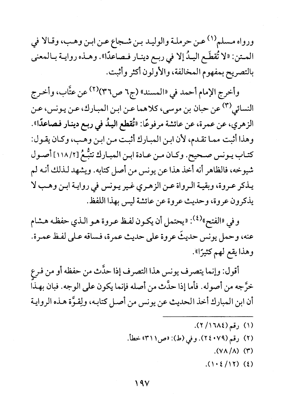 وأخرج الإمام أحمد في «المسند» (ج ٦ ص ٣٦) (¬٢) عن عتَّاب، وأخرج النسائي (¬٣) عن حبان بن موسى، كلاهما عن ابن المبارك، عن يونس، عن الزهري، عن عمرة، عن عائشة مرفوعًا: «تُقطع اليدُ في ربع دينار فصاعدًا». وهذا أثبت مما تقدم، لأن ابن المبارك أثبت من ابن وهب، وكان يقول: كتاب يونس صحيح. وكان من عادة ابن المبارك تتبُّعُ [٢/ ١١٨] أصول شيوخه، فالظاهر أنه أخذ هذا عن يونس من أصل كتابه. ويشهد لذلك أنه لم يذكر عروة، وبقية الرواة عن الزهري غير يونس في رواية ابن وهب لا يذكرون عروة، وحديث عروة عن عائشة ليس بهذا اللفظ.