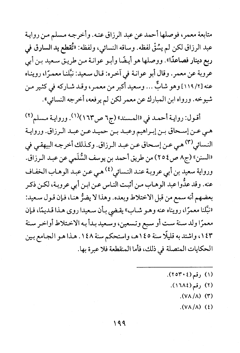 أقول: رواية أحمد في «المسند» (ج ٦ ص ١٦٣) (¬١). ورواية مسلم (¬٢) هي عن إسحاق بن إبراهيم وعبد بن حميد عن عبد الرزاق. ورواية النسائي (¬٣) هي عن إسحاق عن عبد الرزاق. وكذلك أخرجه البيهقي في «السنن» (ج ٨ ص ٢٥٤) من طريق أحمد بن يوسف السُّلَمي عن عبد الرزاق. ورواية سعيد بن أبي عروبة عند النسائي (¬٤) هي عن عبد الوهاب الخفاف عنه. وقد عدُّوا عبد الوهاب من أثبت الناس عن ابن أبي عروبة، لكن ذكر بعضهم أنه سمع من قبل الاختلاط وبعده. وهذا لا يضرُّ هنا، فإن قول سعيد: «نبَّلنا معمرًا، رويناه عنه وهو شاب» يقضي بأن سعيدا روى هذا قديمًا، فإن معمرًا ولد سنة ست أو سبع وتسعين، وسعيد بدأ به الاختلاط أواخر سنة ١٤٣، واشتد به قليلًا سنة ١٤٥ هـ، واستحكم سنة ١٤٨. هذا هو الجامع بين الحكايات المتصلة في ذلك، فأما المنقطعة فلا عبرة بها.