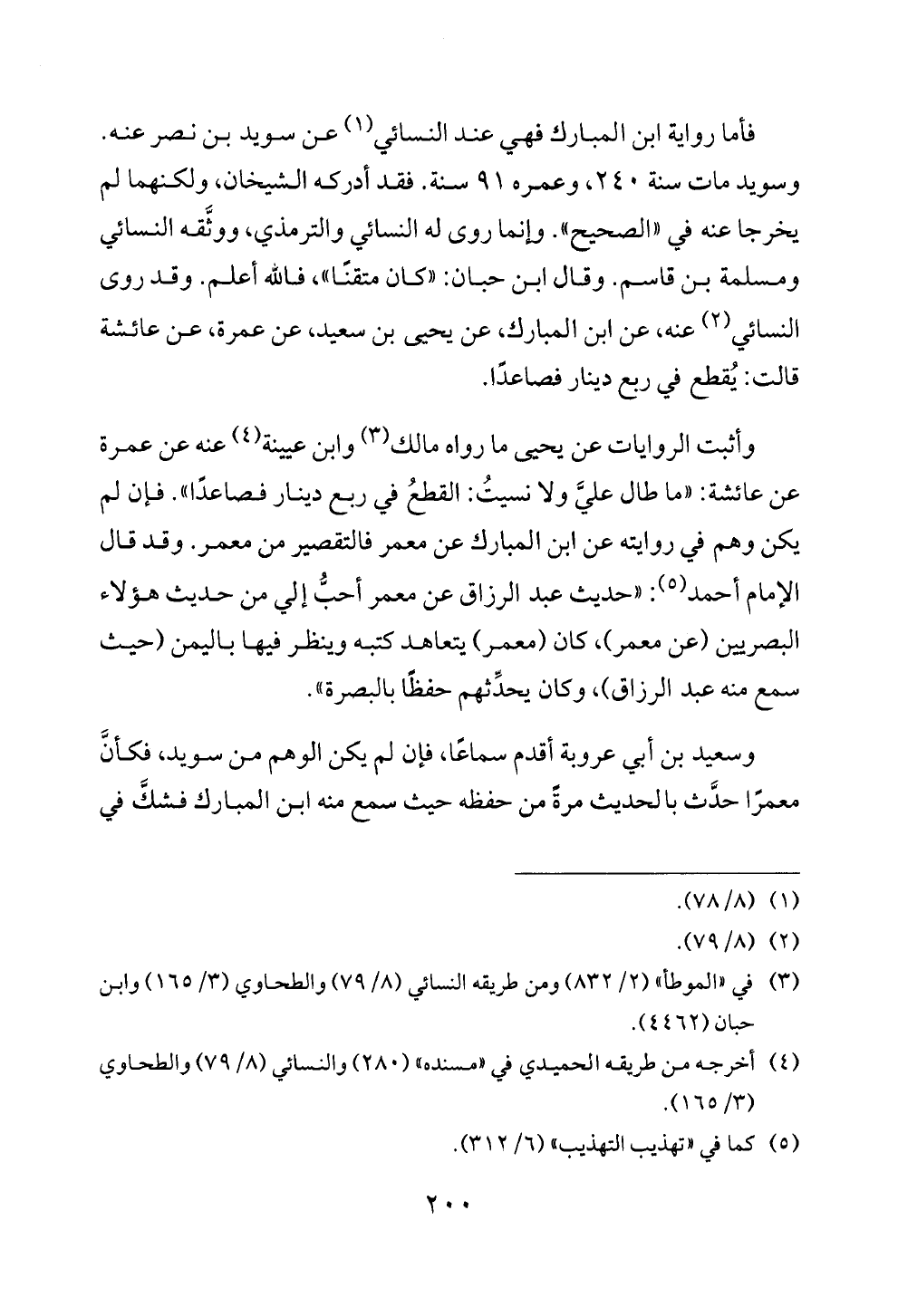 فأما رواية ابن المبارك فهي عند النسائي (¬١) عن سويد بن نصر عنه. وسويد مات سنة ٢٤٠، وعمره ٩١ سنة. فقد أدركه الشيخان، ولكنهما لم يخرجا عنه في «الصحيح». وإنما روى له النسائي والترمذي، ووثَّقه النسائي ومسلمة بن قاسم. وقال ابن حبان: «كان متقنًا»، فالله أعلم. وقد روى النسائي (¬٢) عنه، عن ابن المبارك، عن يحيى بن سعيد، عن عمرة، عن عائشة قالت: يُقطع في ربع دينار فصاعدًا.