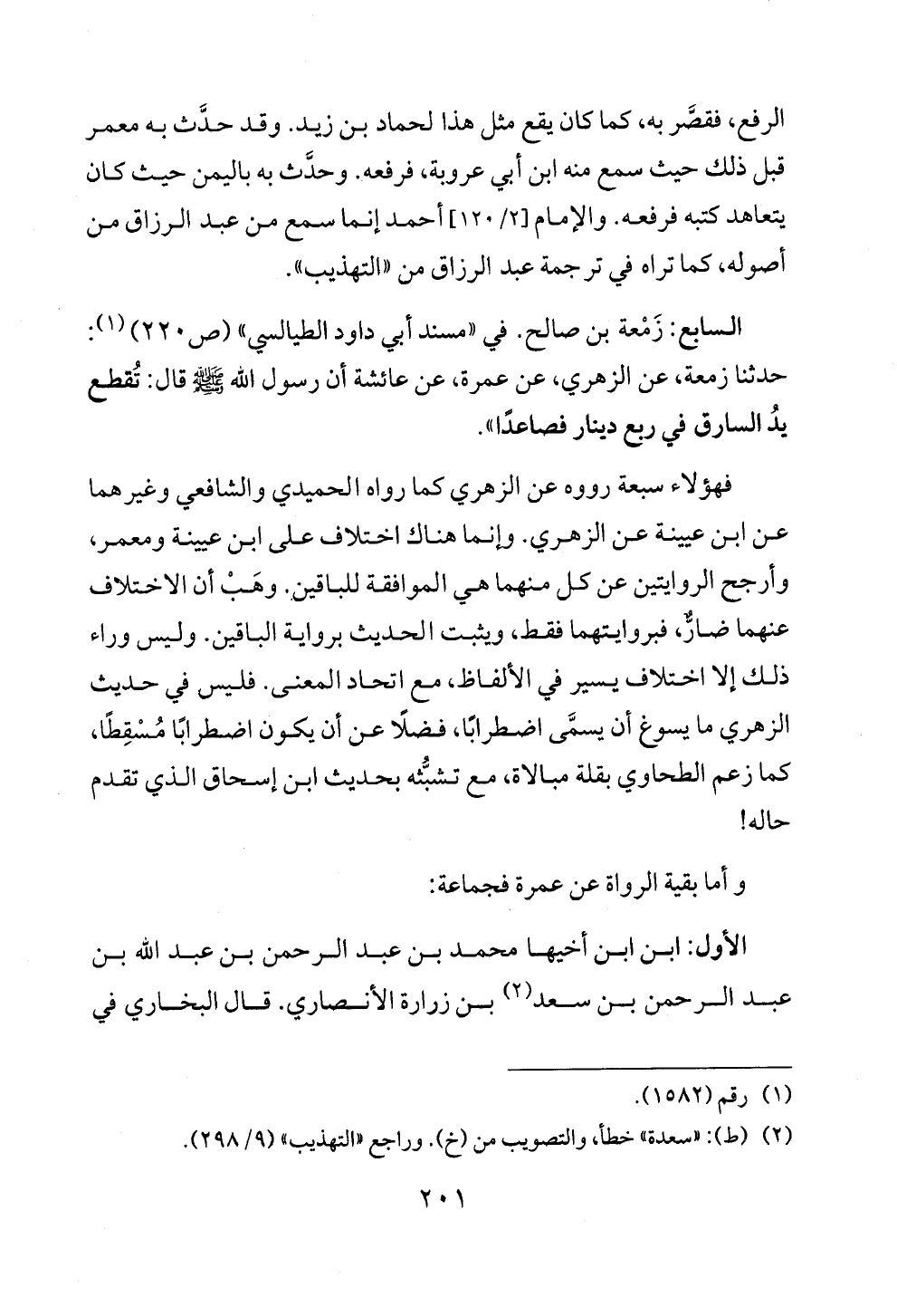 السابع: زَمْعة بن صالح. في «مسند أبي داود الطيالسي» (ص ٢٢٠) (¬١): حدثنا زمعة، عن الزهري، عن عمرة، عن عائشة أن رسول الله - صلى الله عليه وسلم - قال: تُقطع يدُ السارق في ربع دينار فصاعدًا».