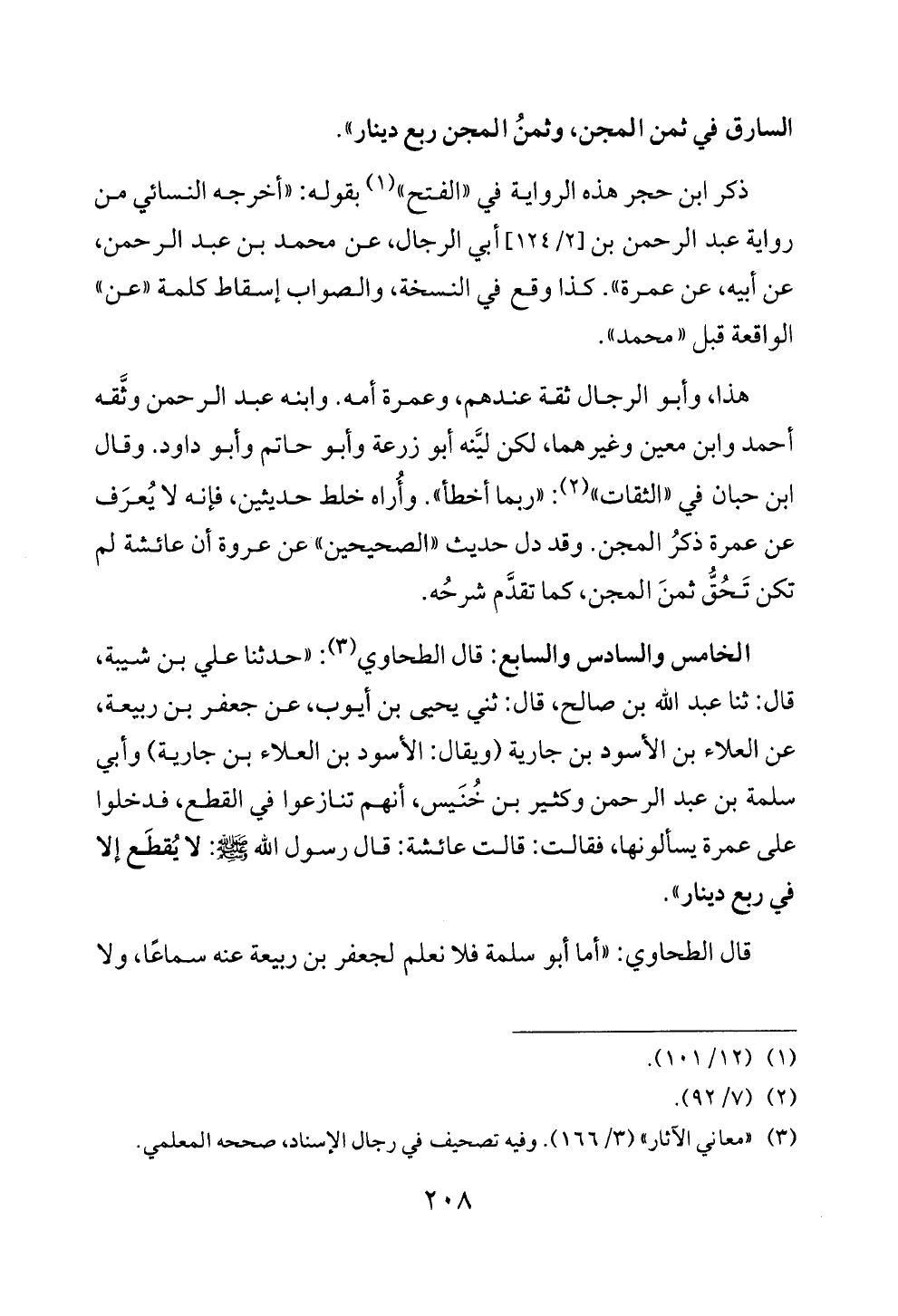 هذا، وأبو الرجال ثقة عندهم، وعمرة أمه. وابنه عبد الرحمن وثَّقه أحمد وابن معين وغيرهما، لكن ليَّنه أبو زرعة وأبو حاتم وأبو داود. وقال ابن حبان في «الثقات» (¬٢): «ربما أخطأ». وأُراه خلط حديثين، فإنه لا يُعرَف عن عمرة ذكرُ المجن. وقد دل حديث «الصحيحين» عن عروة أن عائشة لم تكن تَحُقُّ ثمنَ المجن، كما تقدَّم شرحُه.