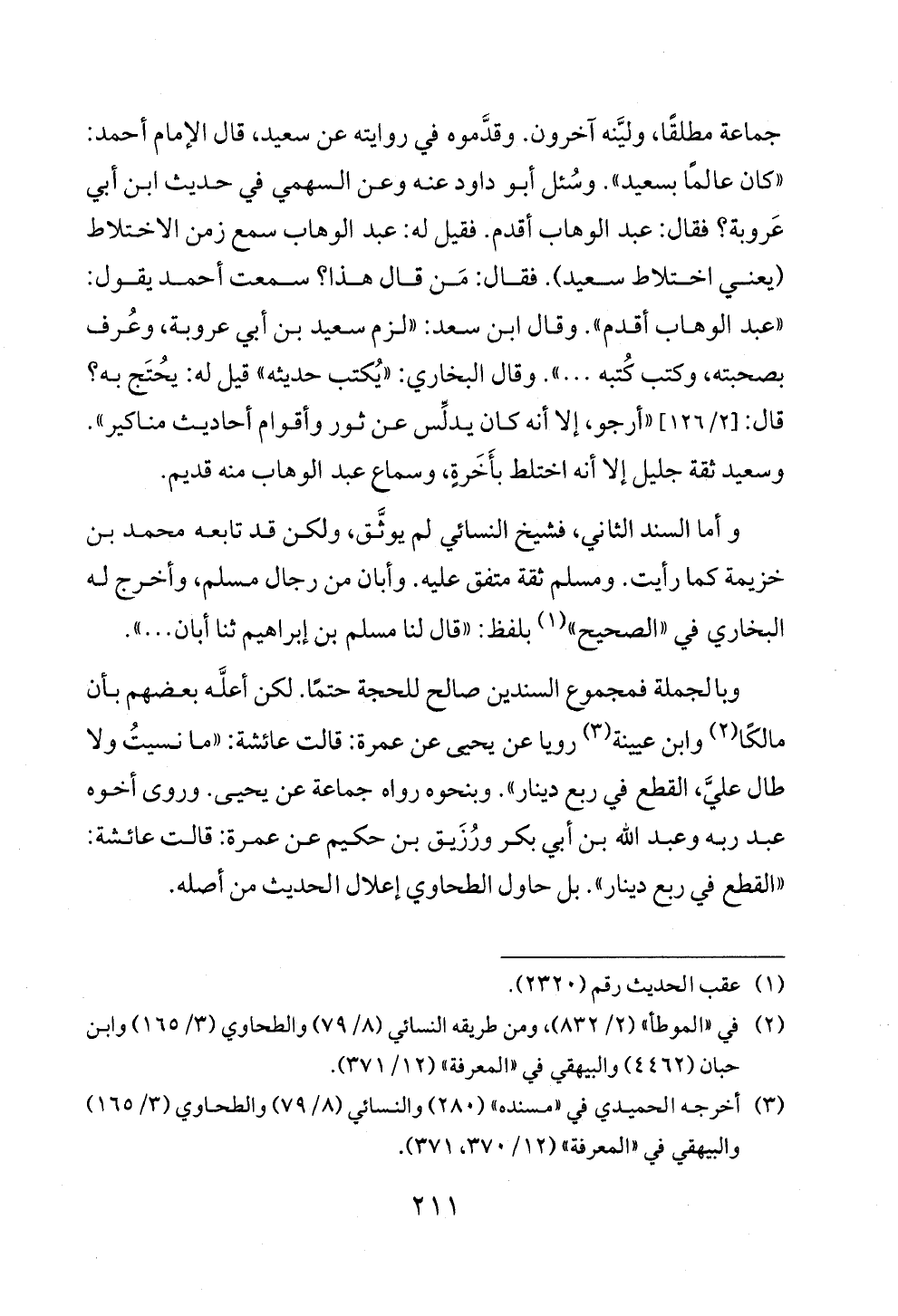 وبالجملة فمجموع السندين صالح للحجة حتمًا. لكن أعلَّه بعضهم بأن مالكًا (¬٢) وابن عيينة (¬٣) رويا عن يحيى عن عمرة: قالت عائشة: «ما نسيتُ ولا طال عليَّ، القطع في ربع دينار». وبنحوه رواه جماعة عن يحيى. وروى أخوه عبد ربه وعبد الله بن أبي بكر ورُزَيق بن حكيم عن عمرة: قالت عائشة: «القطع في ربع دينار». بل حاول الطحاوي إعلال الحديث من أصله.