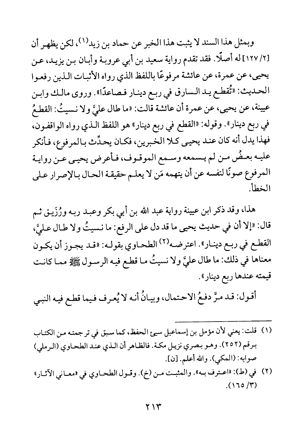 وبمثل هذا السند لا يثبت هذا الخبر عن حماد بن زيد (¬١)، لكن يظهر أن [٢/ ١٢٧] له أصلًا. فقد تقدم رواية سعيد بن أبي عروبة وأبان بن يزيد، عن يحيى، عن عمرة، عن عائشة مرفوعًا باللفظ الذي رواه الأثبات الذين رفعوا الحديث: «تُقطع يد السارق في ربع دينار فصاعدًا». وروى مالك وابن عيينة، عن يحيى، عن عمرة أن عائشة قالت: «ما طال عليَّ ولا نسيتُ: القطعُ في ربع دينار». وقوله: «القطع في ربع دينار» هو اللفظ الذي رواه الواقفون، فهذا يدل أنه كان عند يحيى كلا الخبرين، فكان يحدِّث بالمرفوع، فأنكر عليه بعضُ من لم يسمعه وسمع الموقوف، فأعرض يحيى عن رواية المرفوع صونًا لنفسه عن أن يتهمه مَن لا يعلم حقيقة الحال بالإصرار على الخطأ.