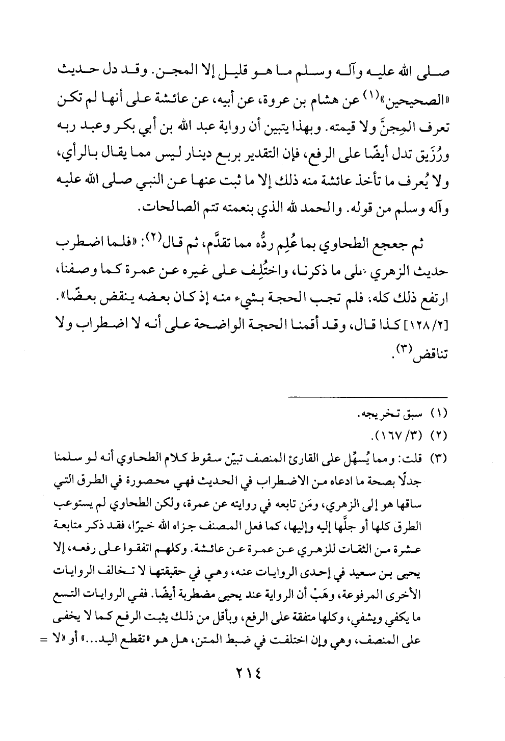 (¬٣) قلت: ومما يُسهِّل على القارئ المنصف تبيّن سقوط كلام الطحاوي أنه لو سلمنا جدلًا بصحة ما ادعاه من الاضطراب في الحديث فهي محصورة في الطرق التي ساقها هو إلى الزهري، ومَن تابعه في روايته عن عمرة، ولكن الطحاوي لم يستوعب الطرق كلها أو جلَّها إليه وإليها، كما فعل المصنف جزاه الله خيرًا، فقد ذكر متابعة عشرة من الثقات للزهري عن عمرة عن عائشة. وكلهم اتفقوا على رفعه، إلا يحيى بن سعيد في إحدى الروايات عنه، وهي في حقيقتها لا تخالف الروايات الأخرى المرفوعة، وهَبْ أن الرواية عند يحيى مضطربة أيضًا. ففي الروايات التسع ما يكفي ويشفي، وكلها متفقة على الرفع، وبأقل من ذلك يثبت الرفع كما لا يخفى على المنصف، وهي وإن اختلفت في ضبط المتن، هل هو «تقطع اليد ... » أو «لا تقطع ... » والمؤلف رجح الأول، وقد يمكن ترجيح الآخر بقاعدة: «زيادة الثقة مقبولة»، وسواء كان هذا أو ذاك، فالحجة في الحديث قائمة على أن اليد تقطع في ربع دينار، وذلك ما لا يقوله الطحاوي تبعًا لمذهبه. والله المستعان. [ن].