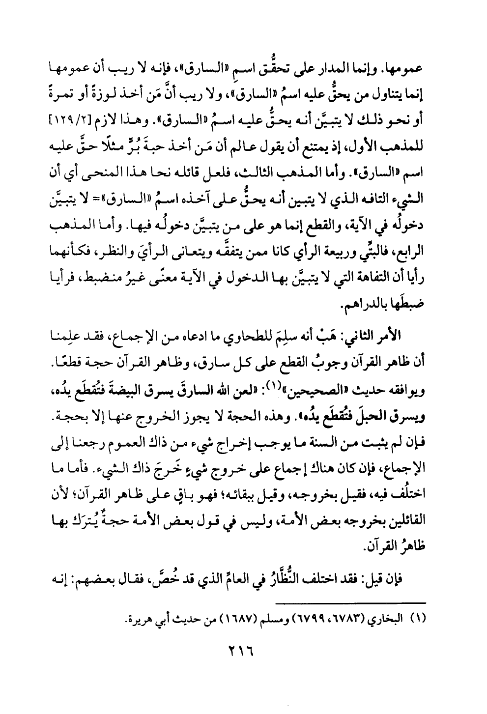 الأمر الثاني: هَبْ أنه سلِمَ للطحاوي ما ادعاه من الإجماع، فقد علِمنا أن ظاهر القرآن وجوبُ القطع على كل سارق، وظاهر القرآن حجة قطعًا. ويوافقه حديث «الصحيحين» (¬١): «لعن الله السارقَ يسرق البيضةَ فتُقطَع يدُه، ويسرق الحبلَ فتُقطَع يدُه». وهذه الحجة لا يجوز الخروج عنها إلا بحجة. فإن لم يثبت من السنة ما يوجب إخراج شيء من ذاك العموم رجعنا إلى الإجماع، فإن كان هناك إجماع على خروج شيءٍ خَرجَ ذاك الشيء. فأما ما اختلُف فيه، فقيل بخروجه، وقيل ببقائه؛ فهو باقٍ على ظاهر القرآن؛ لأن القائلين بخروجه بعض الأمة، وليس في قول بعض الأمة حجةٌ يُترَك بها ظاهرُ القرآن.