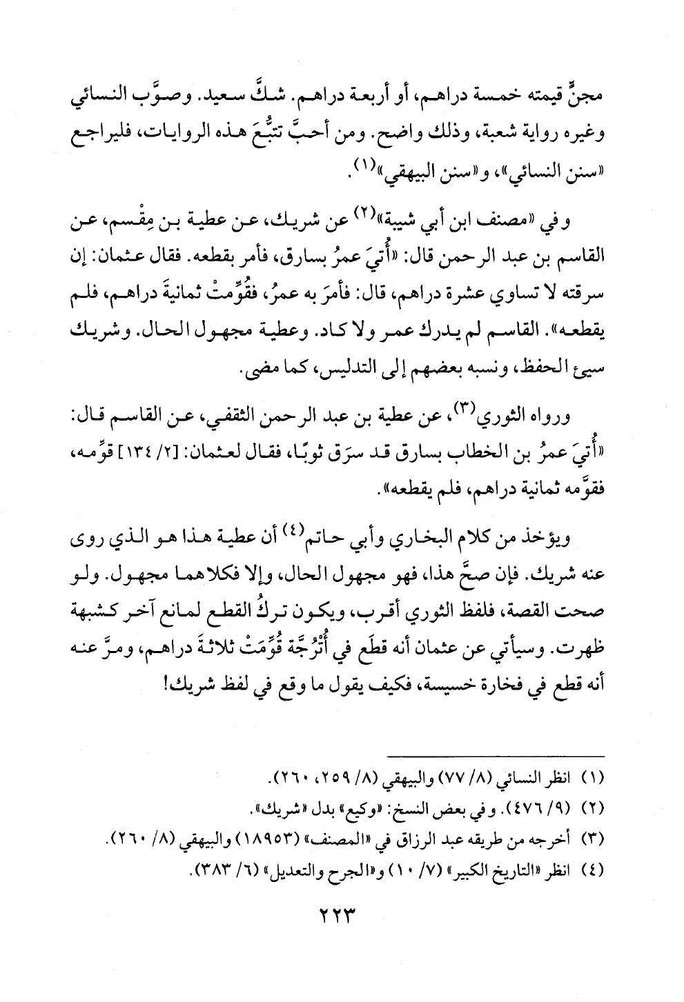 وفي «مصنف ابن أبي شيبة» (¬٢) عن شريك، عن عطية بن مِقْسم، عن القاسم بن عبد الرحمن قال: «أُتيَ عمرُ بسارق، فأمر بقطعه. فقال عثمان: إن سرقته لا تساوي عشرة دراهم، قال: فأمرَ به عمرُ، فقُوِّمتْ ثمانيةَ دراهم، فلم يقطعه». القاسم لم يدرك عمر ولا كاد. وعطية مجهول الحال. وشريك سيئ الحفظ، ونسبه بعضهم إلى التدليس، كما مضى.
