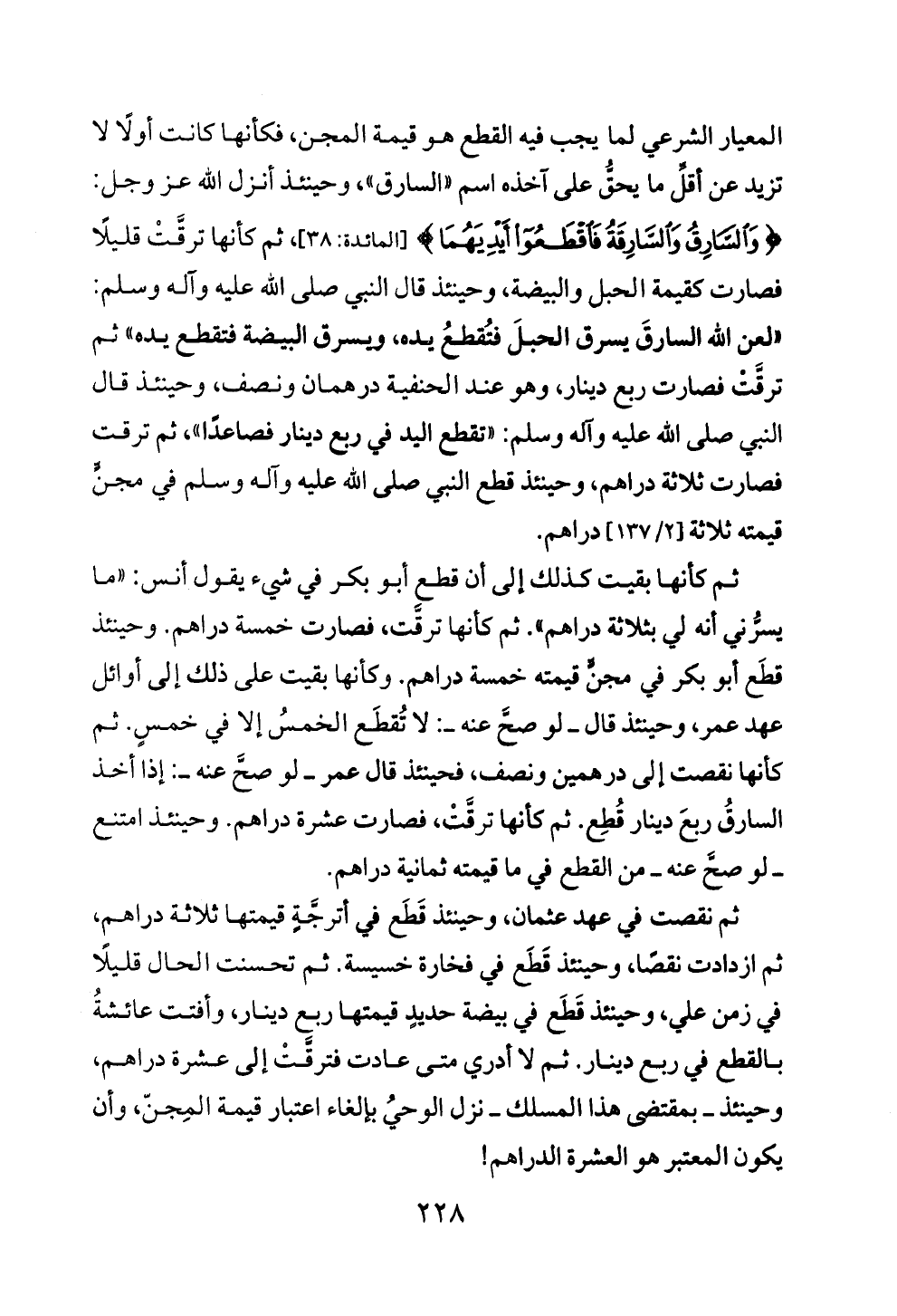 ثم كأنها بقيت كذلك إلى أن قطع أبو بكر في شيء يقول أنس: «ما يسرُّني أنه لي بثلاثة دراهم». ثم كأنها ترقَّت، فصارت خمسة دراهم. وحينئذ قطَع أبو بكر في مجنٍّ قيمته خمسة دراهم. وكأنها بقيت على ذلك إلى أوائل عهد عمر، وحينئذ قال ــ لو صحَّ عنه ــ: لا تُقطَع الخمسُ إلا في خمسٍ. ثم كأنها نقصت إلى درهمين ونصف، فحينئذ قال عمر ــ لو صحَّ عنه ــ: إذا أخذ السارقُ ربعَ دينار قُطِع. ثم كأنها ترقَّتْ، فصارت عشرة دراهم. وحينئذ امتنع ــ لو صحَّ عنه ــ من القطع في ما قيمته ثمانية دراهم.