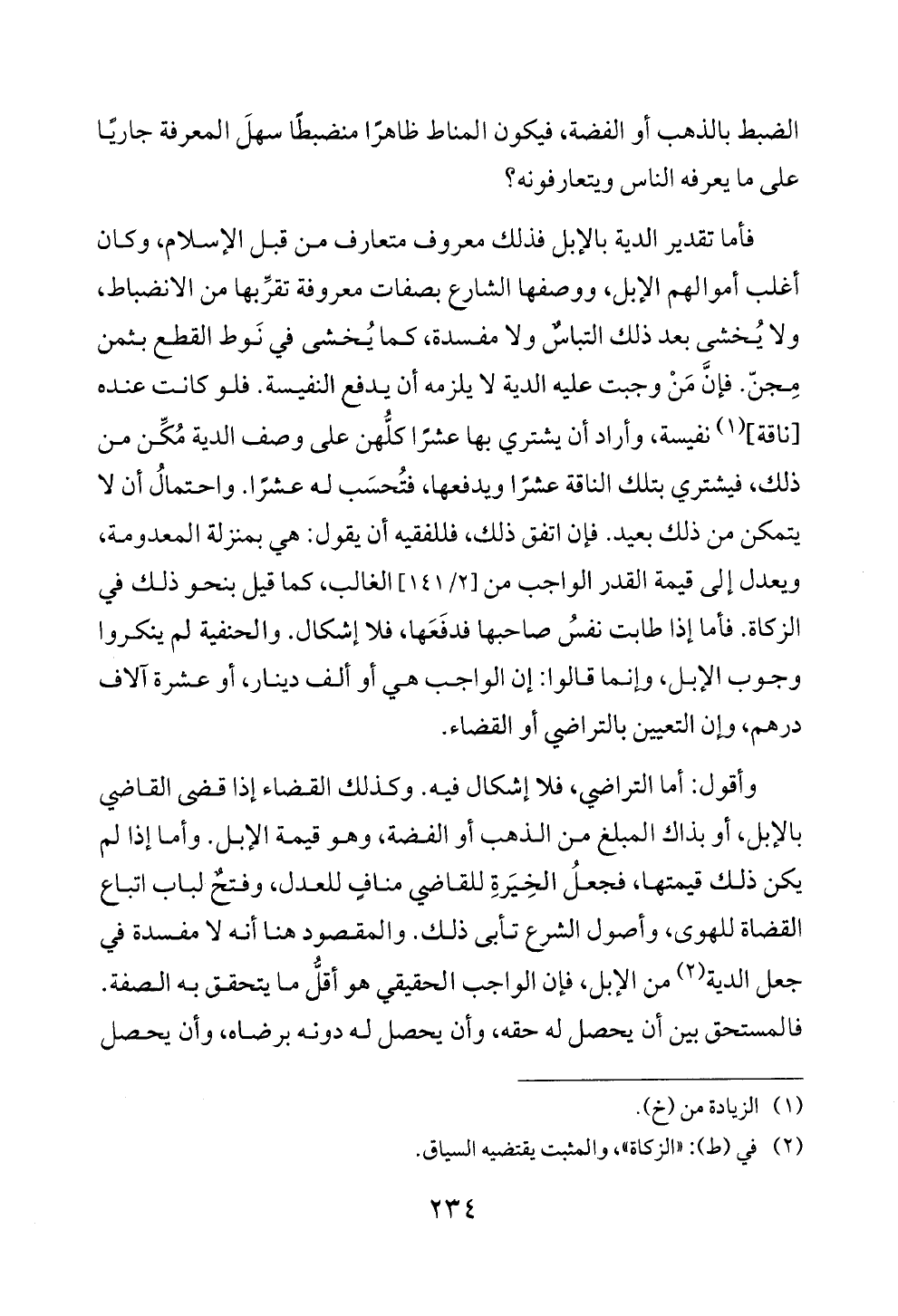فأما تقدير الدية بالإبل فذلك معروف متعارف من قبل الإسلام، وكان أغلب أموالهم الإبل، ووصفها الشارع بصفات معروفة تقرِّبها من الانضباط، ولا يُخشى بعد ذلك التباسٌ ولا مفسدة، كما يُخشى في نَوط القطع بثمن مِجنّ. فإنَّ مَنْ وجبت عليه الدية لا يلزمه أن يدفع النفيسة. فلو كانت عنده [ناقة] (¬١) نفيسة، وأراد أن يشتري بها عشرًا كلُّهن على وصف الدية مُكِّن من ذلك، فيشتري بتلك الناقة عشرًا ويدفعها، فتُحسَب له عشرًا. واحتمالُ أن لا يتمكن من ذلك بعيد. فإن اتفق ذلك، فللفقيه أن يقول: هي بمنزلة المعدومة، ويعدل إلى قيمة القدر الواجب من [٢/ ١٤١] الغالب، كما قيل بنحو ذلك في الزكاة. فأما إذا طابت نفسُ صاحبها فدفَعَها، فلا إشكال. والحنفية لم ينكروا وجوب الإبل، وإنما قالوا: إن الواجب هي أو ألف دينار، أو عشرة آلاف درهم، وإن التعيين بالتراضي أو القضاء.