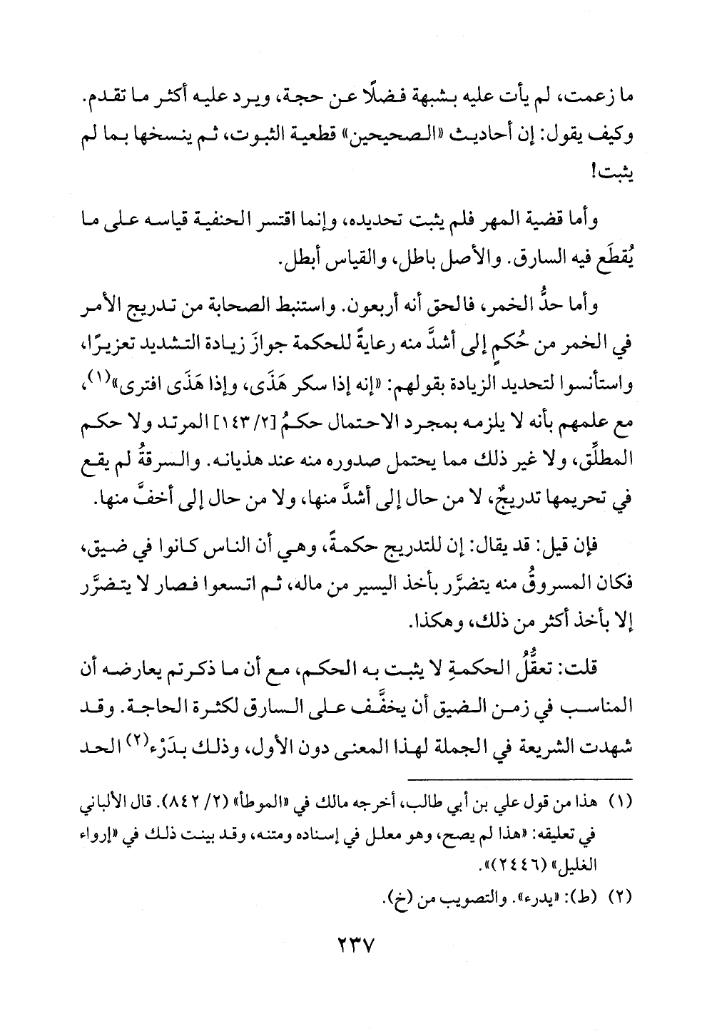 وأما حدُّ الخمر، فالحق أنه أربعون. واستنبط الصحابة من تدريج الأمر في الخمر من حُكمٍ إلى أشدَّ منه رعايةً للحكمة جوازَ زيادة التشديد تعزيرًا، واستأنسوا لتحديد الزيادة بقولهم: «إنه إذا سكر هَذَى، وإذا هَذَى افترى» (¬١)، مع علمهم بأنه لا يلزمه بمجرد الاحتمال حكمُ [٢/ ١٤٣] المرتد ولا حكم المطلِّق، ولا غير ذلك مما يحتمل صدوره منه عند هذيانه. والسرقةُ لم يقع في تحريمها تدريجٌ، لا من حال إلى أشدَّ منها، ولا من حال إلى أخفَّ منها.