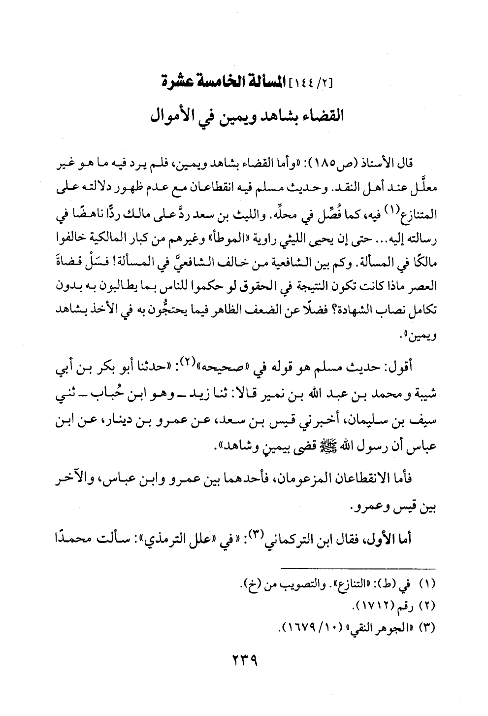 قال الأستاذ (ص ١٨٥): «وأما القضاء بشاهد ويمين، فلم يرد فيه ما هو غير معلَّل عند أهل النقد. وحديث مسلم فيه انقطاعان مع عدم ظهور دلالته على المتنازع (¬١) فيه، كما فُصِّل في محلِّه. والليث بن سعد ردَّ على مالك ردًّا ناهضًا في رسالته إليه ... حتى إن يحيى الليثي راوية «الموطأ» وغيرهم من كبار المالكية خالفوا مالكًا في المسألة. وكم بين الشافعية من خالف الشافعيَّ في المسألة! فسَلْ قضاةَ العصر ماذا كانت تكون النتيجة في الحقوق لو حكموا للناس بما يطالبون به بدون تكامل نصاب الشهادة؟ فضلًا عن الضعف الظاهر فيما يحتجُّون به في الأخذ بشاهد ويمين».