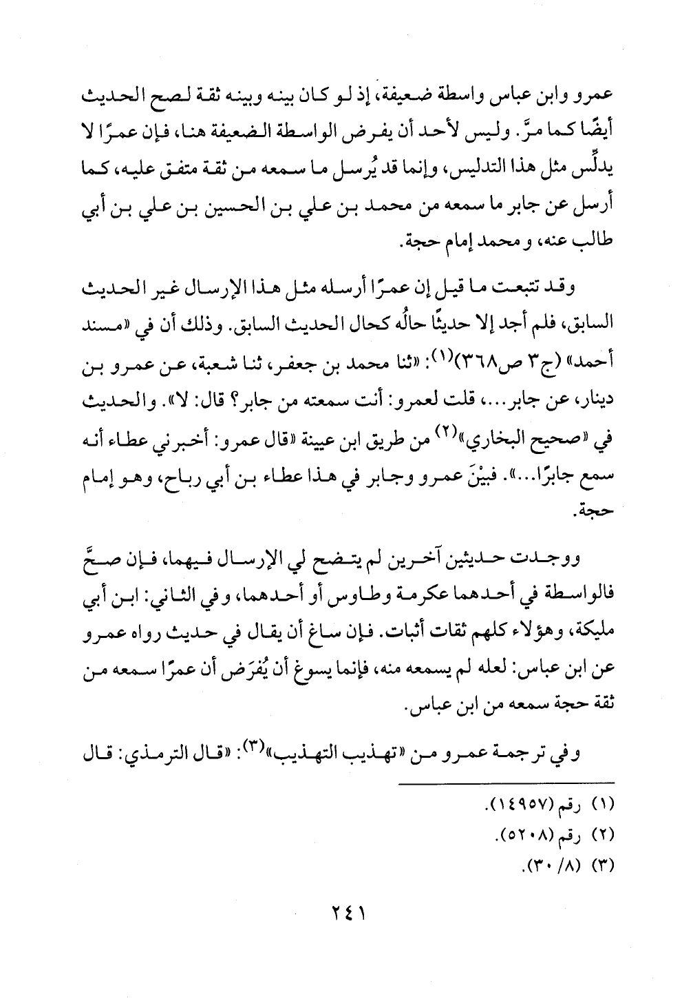 ووجدت حديثين آخرين لم يتضح لي الإرسال فيهما، فإن صحَّ فالواسطة في أحدهما عكرمة وطاوس أو أحدهما، وفي الثاني: ابن أبي مليكة، وهؤلاء كلهم ثقات أثبات. فإن ساغ أن يقال في حديث رواه عمرو عن ابن عباس: لعله لم يسمعه منه، فإنما يسوغ أن يُفرَض أن عمرًا سمعه من ثقة حجة سمعه من ابن عباس.