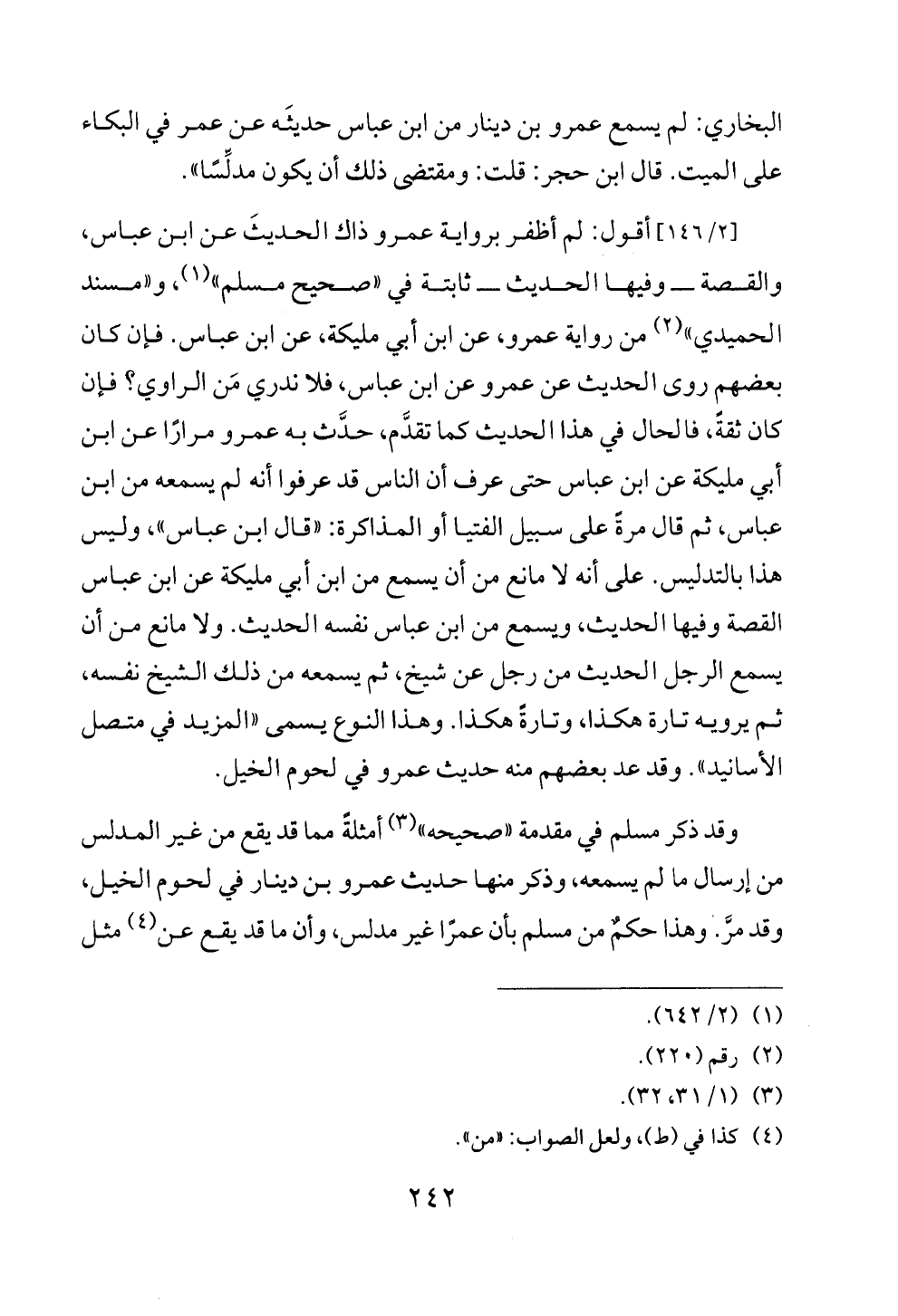 وقد ذكر مسلم في مقدمة «صحيحه» (¬٣) أمثلةً مما قد يقع من غير المدلس من إرسال ما لم يسمعه، وذكر منها حديث عمرو بن دينار في لحوم الخيل، وقد مرَّ. وهذا حكمٌ من مسلم بأن عمرًا غير مدلس، وأن ما قد يقع عن (¬٤) مثل