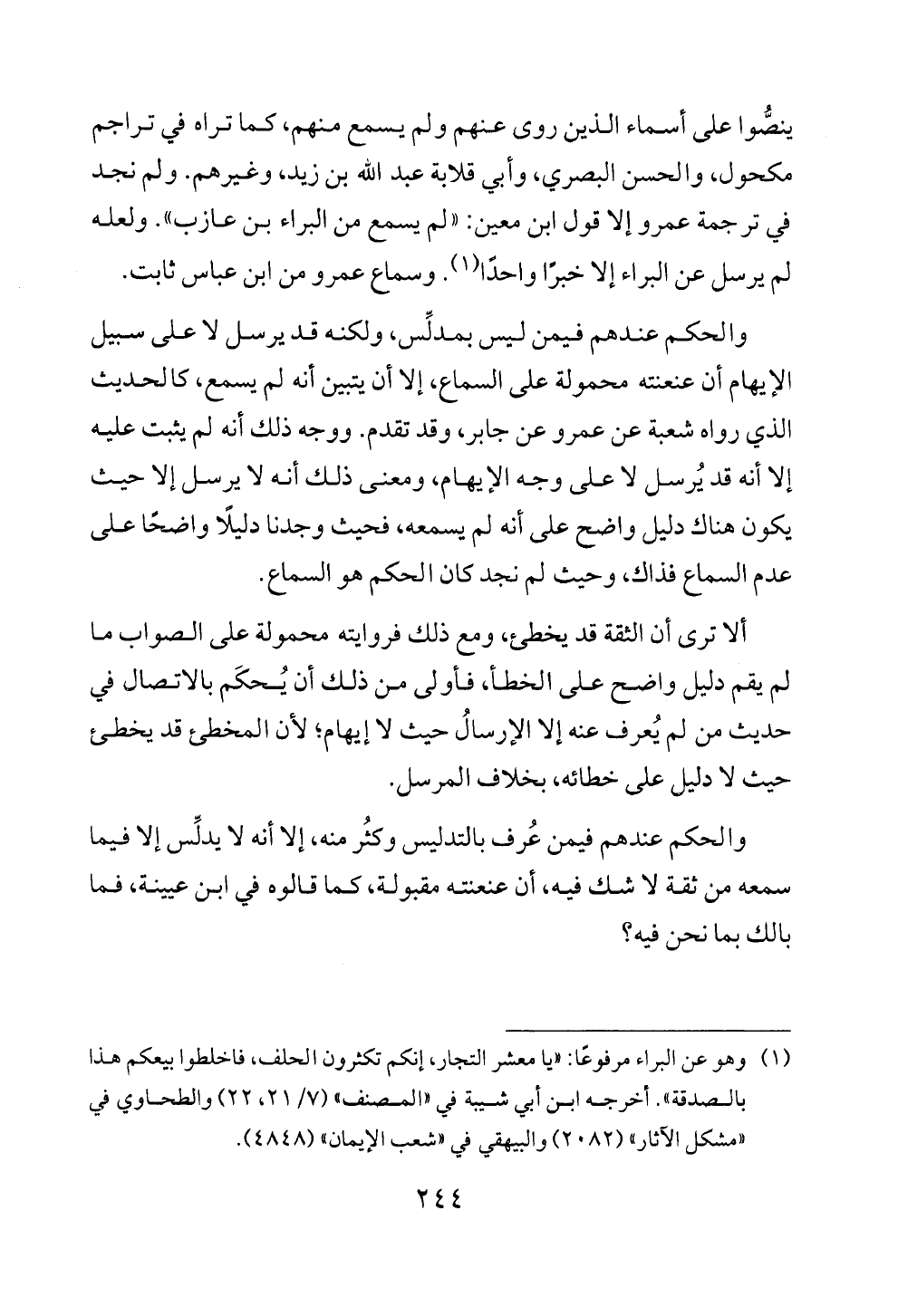 والحكم عندهم فيمن ليس بمدلِّس، ولكنه قد يرسل لا على سبيل الإيهام أن عنعنته محمولة على السماع، إلا أن يتبين أنه لم يسمع، كالحديث الذي رواه شعبة عن عمرو عن جابر، وقد تقدم. ووجه ذلك أنه لم يثبت عليه إلا أنه قد يُرسل لا على وجه الإيهام، ومعنى ذلك أنه لا يرسل إلا حيث يكون هناك دليل واضح على أنه لم يسمعه، فحيث وجدنا دليلًا واضحًا على عدم السماع فذاك، وحيث لم نجد كان الحكم هو السماع.