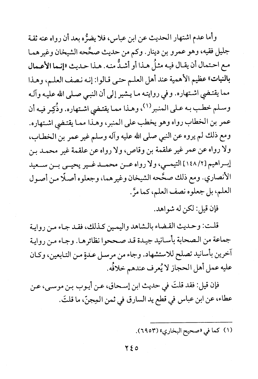 وأما عدم اشتهار الحديث عن ابن عباس، فلا يضرُّه بعد أن رواه عنه ثقة جليل فقيه، وهو عمرو بن دينار. وكم من حديث صحَّحه الشيخان وغيرهما مع احتمال أن يقال فيه مثلُ هذا أو أشدُّ منه. هذا حديث «إنما الأعمال بالنيات» عظيم الأهمية عند أهل العلم حتى قالوا: إنه نصف العلم، وهذا مما يقتضي اشتهاره. وفي روايته ما يشير إلى أن النبي صلى الله عليه وآله وسلم خطب به على المنبر (¬١)، وهذا مما يقتضي اشتهاره. وذُكِر فيه أن عمر بن الخطاب رواه وهو يخطب على المنبر، وهذا مما يقتضي اشتهاره. ومع ذلك لم يروه عن النبي صلى الله عليه وآله وسلم غير عمر بن الخطاب، ولا رواه عن عمر غير علقمة بن وقاص، ولا رواه عن علقمة غير محمد بن إبراهيم [٢/ ١٤٨] التيمي، ولا رواه عن محمد غير يحيى بن سعيد الأنصاري. ومع ذلك صحَّحه الشيخان وغيرهما، وجعلوه أصلًا من أصول العلم، بل جعلوه نصف العلم، كما مرَّ.