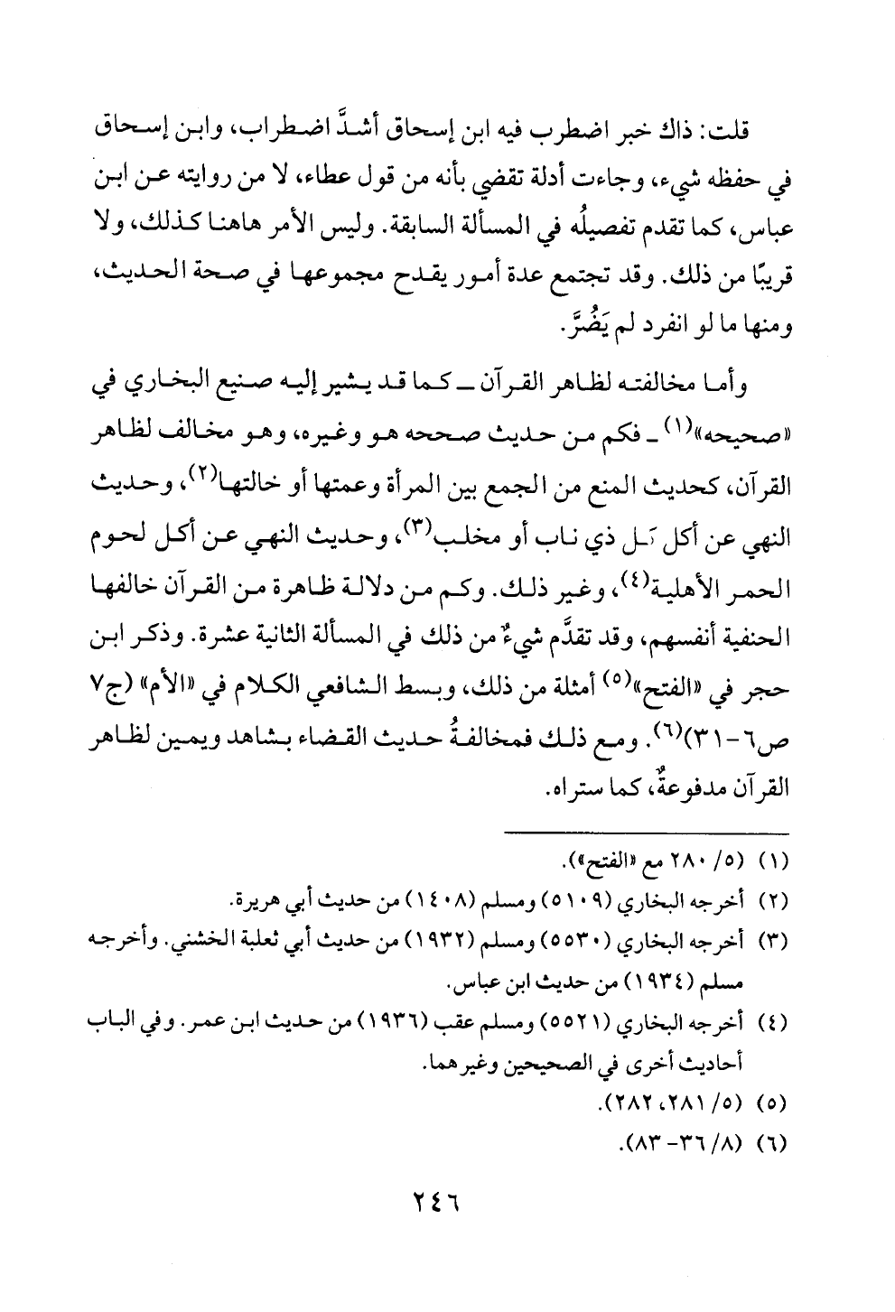 وأما مخالفته لظاهر القرآن ــ كما قد يشير إليه صنيع البخاري في «صحيحه» (¬١) ــ فكم من حديث صححه هو وغيره، وهو مخالف لظاهر القرآن، كحديث المنع من الجمع بين المرأة وعمتها أو خالتها (¬٢)، وحديث النهي عن أكل كل ذي ناب أو مخلب (¬٣)، وحديث النهي عن أكل لحوم الحمر الأهلية (¬٤)، وغير ذلك. وكم من دلالة ظاهرة من القرآن خالفها الحنفية أنفسهم، وقد تقدَّم شيءٌ من ذلك في المسألة الثانية عشرة. وذكر ابن حجر في «الفتح» (¬٥) أمثلة من ذلك، وبسط الشافعي الكلام في «الأم» (ج ٧ ص ٦ - ٣١) (¬٦). ومع ذلك فمخالفةُ حديث القضاء بشاهد ويمين لظاهر القرآن مدفوعةٌ، كما ستراه.