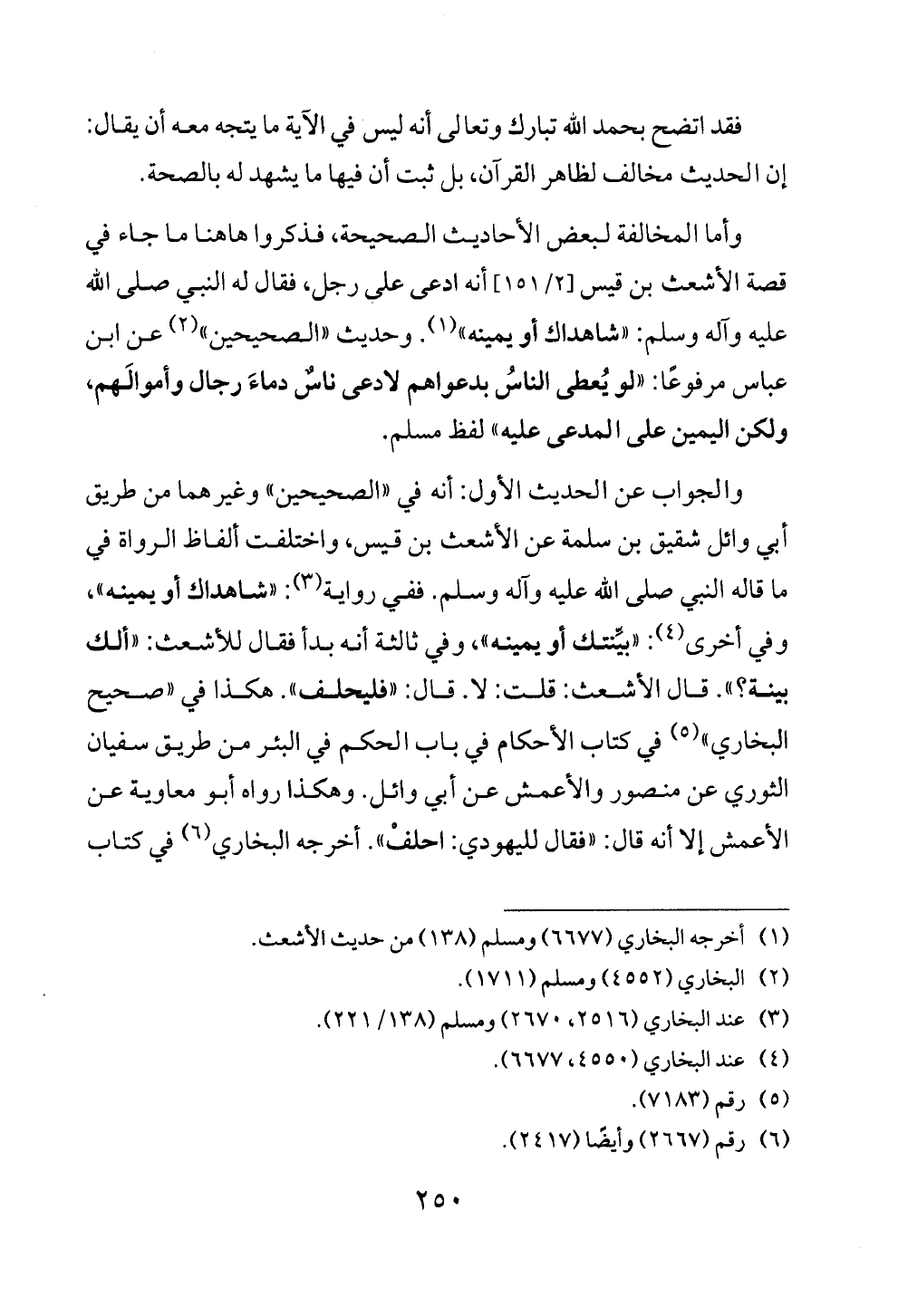 وأما المخالفة لبعض الأحاديث الصحيحة، فذكروا هاهنا ما جاء في قصة الأشعث بن قيس [٢/ ١٥١] أنه ادعى على رجل، فقال له النبي صلى الله عليه وآله وسلم: «شاهداك أو يمينه» (¬١). وحديث «الصحيحين» (¬٢) عن ابن عباس مرفوعًا: «لو يُعطى الناسُ بدعواهم لادعى ناسٌ دماءَ رجال وأموالَهم، ولكن اليمين على المدعى عليه» لفظ مسلم.