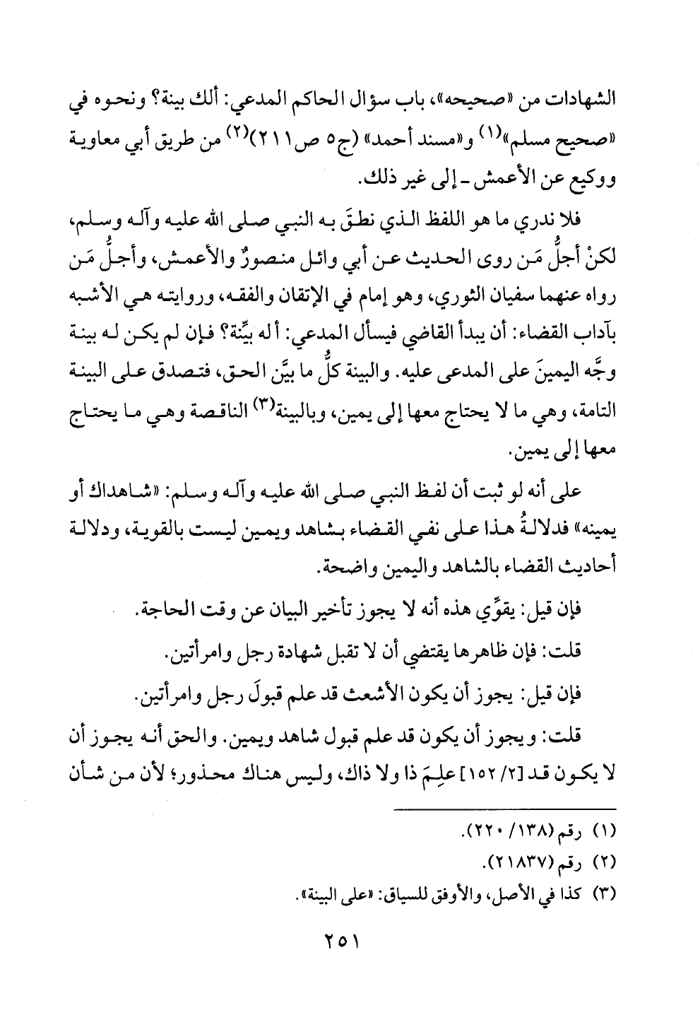 فلا ندري ما هو اللفظ الذي نطقَ به النبي صلى الله عليه وآله وسلم، لكنْ أجلُّ مَن روى الحديث عن أبي وائل منصورٌ والأعمش، وأجلُّ مَن رواه عنهما سفيان الثوري، وهو إمام في الإتقان والفقه، وروايته هي الأشبه بآداب القضاء: أن يبدأ القاضي فيسأل المدعي: أله بيِّنة؟ فإن لم يكن له بينة وجَّه اليمينَ على المدعى عليه. والبينة كلُّ ما بيَّن الحق، فتصدق على البينة التامة، وهي ما لا يحتاج معها إلى يمين، وبالبينة (¬٣) الناقصة وهي ما يحتاج معها إلى يمين.