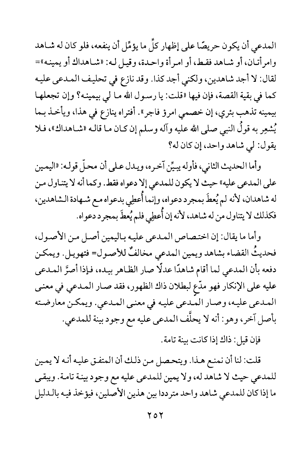 قلت: لنا أن نمنع هذا. ويتحصل من ذلك أن المتفق عليه أنه لا يمين للمدعي حيث لا شاهد له، ولا يمين للمدعى عليه مع وجود بينة تامة. ويبقى ما إذا كان للمدعي شاهد واحد مترددا بين هذين الأصلين، فيؤخذ فيه بالدليل