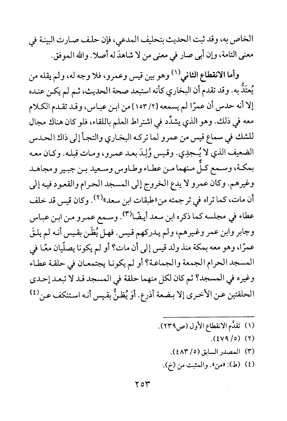وأما الانقطاع الثاني (¬١) وهو بين قيس وعمرو، فلا وجه له، ولم يقله من يُعتَدُّ به. وقد تقدم أن البخاري كأنه استبعد صحة الحديث، ثم لم يكن عنده إلا أنه حدس أن عمرًا لم يسمعه [٢/ ١٥٣] من ابن عباس، وقد تقدم الكلام معه في ذلك. وهو الذي يشدِّد في اشتراط العلم باللقاء، فلو كان هناك مجال للشك في سماع قيس من عمرو لما تركه البخاري والتجأ إلى ذاك الحدس الضعيف الذي لا يُجدِي. وقيس وُلِدَ بعد عمرو، ومات قبله. وكان معه بمكة، وسمع كلٌّ منهما من عطاء وطاوس وسعيد بن جبير ومجاهد وغيرهم. وكان عمرو لا يدع الخروج إلى المسجد الحرام والقعود فيه إلى أن مات، كما تراه في ترجمته من «طبقات ابن سعد» (¬٢). وكان قيس قد خلف عطاء في مجلسه كما ذكره ابن سعد أيضًا (¬٣). وسمع عمرو من ابن عباس وجابر وابن عمر وغيرهم، ولم يدركهم قيس. فهل يُظَن بقيس أنه لم يلقَ عمرًا، وهو معه بمكة منذ ولد قيس إلى أن مات؟ أو لم يكونا يصلّيان معًا في المسجد الحرام الجمعة والجماعة؟ أو لم يكونا يجتمعان في حلقة عطاء وغيره في المسجد؟ ثم كان لكل منهما حلقة في المسجد قد لا تبعد إحدى الحلقتين عن الأخرى إلا بضعة أذرع. أوَ يُظنُّ بقيس أنه استنكف عن (¬٤)