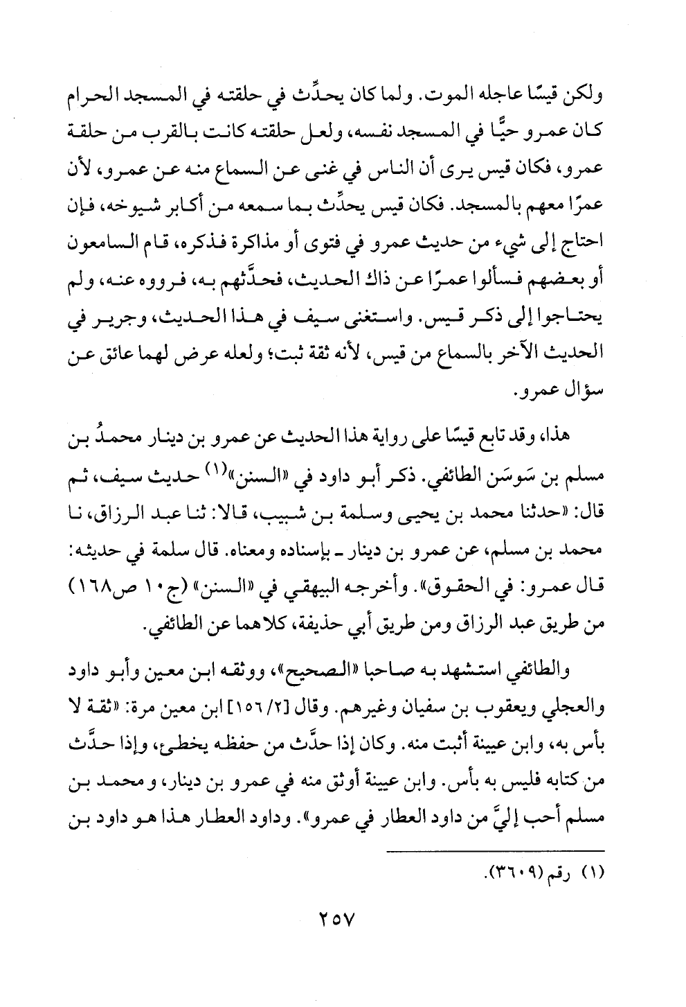 ولكن قيسًا عاجله الموت. ولما كان يحدِّث في حلقته في المسجد الحرام كان عمرو حيًّا في المسجد نفسه، ولعل حلقته كانت بالقرب من حلقة عمرو، فكان قيس يرى أن الناس في غنى عن السماع منه عن عمرو، لأن عمرًا معهم بالمسجد. فكان قيس يحدِّث بما سمعه من أكابر شيوخه، فإن احتاج إلى شيء من حديث عمرو في فتوى أو مذاكرة فذكره، قام السامعون أو بعضهم فسألوا عمرًا عن ذاك الحديث، فحدَّثهم به، فرووه عنه، ولم يحتاجوا إلى ذكر قيس. واستغنى سيف في هذا الحديث، وجرير في الحديث الآخر بالسماع من قيس، لأنه ثقة ثبت؛ ولعله عرض لهما عائق عن سؤال عمرو.