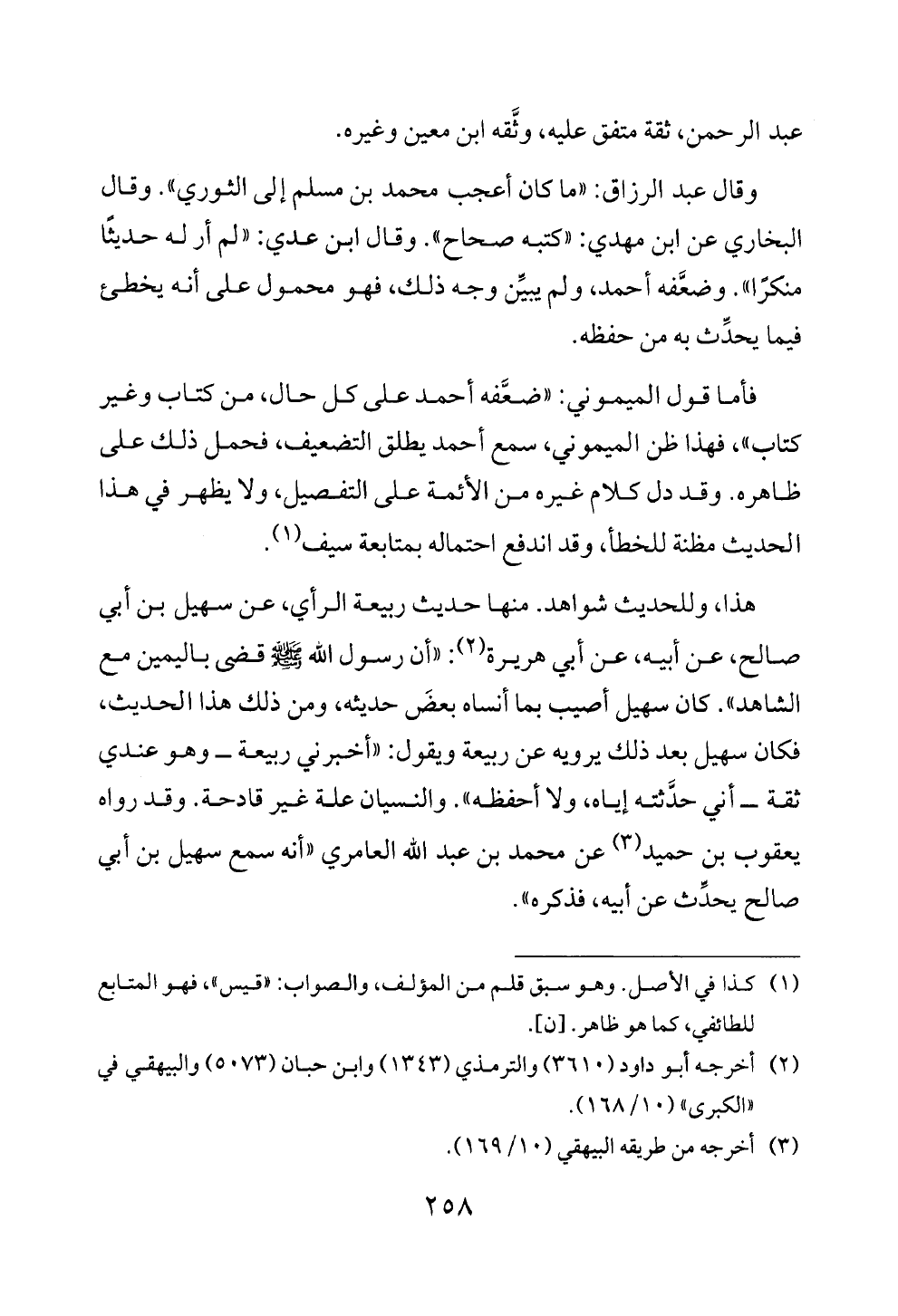 فأما قول الميموني: «ضعَّفه أحمد على كل حال، من كتاب وغير كتاب»، فهذا ظن الميموني، سمع أحمد يطلق التضعيف، فحمل ذلك على ظاهره. وقد دل كلام غيره من الأئمة على التفصيل، ولا يظهر في هذا الحديث مظنة للخطأ، وقد اندفع احتماله بمتابعة سيف (¬١).