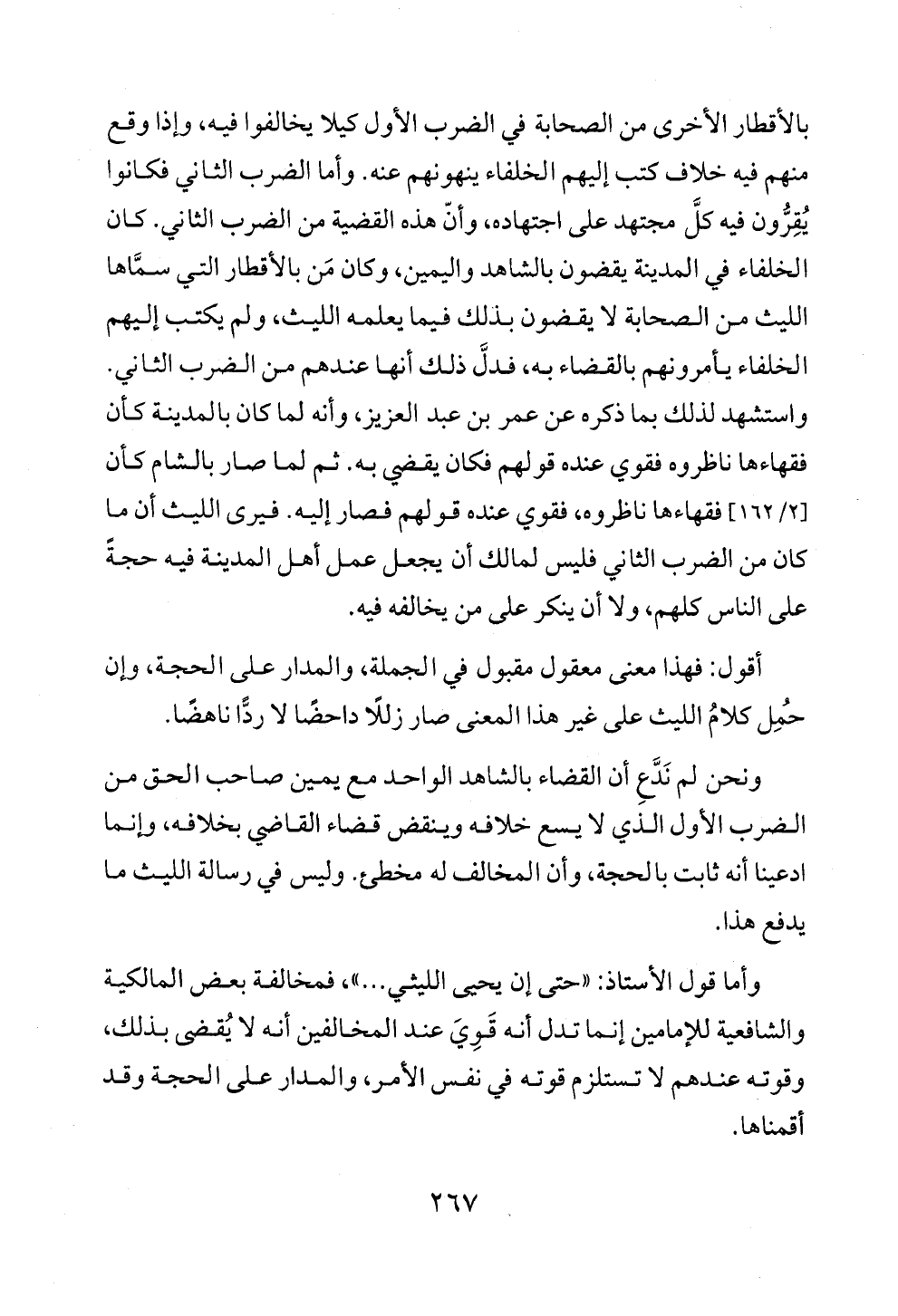 ونحن لم نَدَّعِ أن القضاء بالشاهد الواحد مع يمين صاحب الحق من الضرب الأول الذي لا يسع خلافه وينقض قضاء القاضي بخلافه، وإنما ادعينا أنه ثابت بالحجة، وأن المخالف له مخطئ. وليس في رسالة الليث ما يدفع هذا.